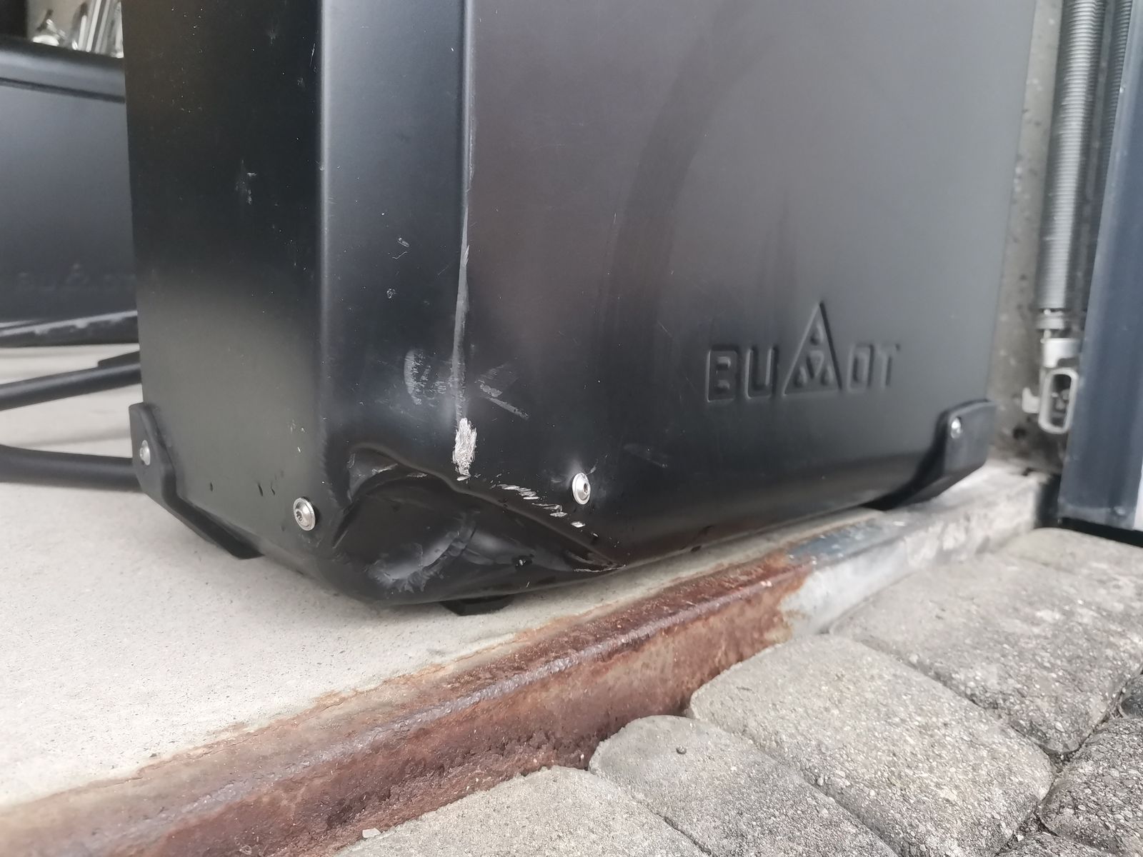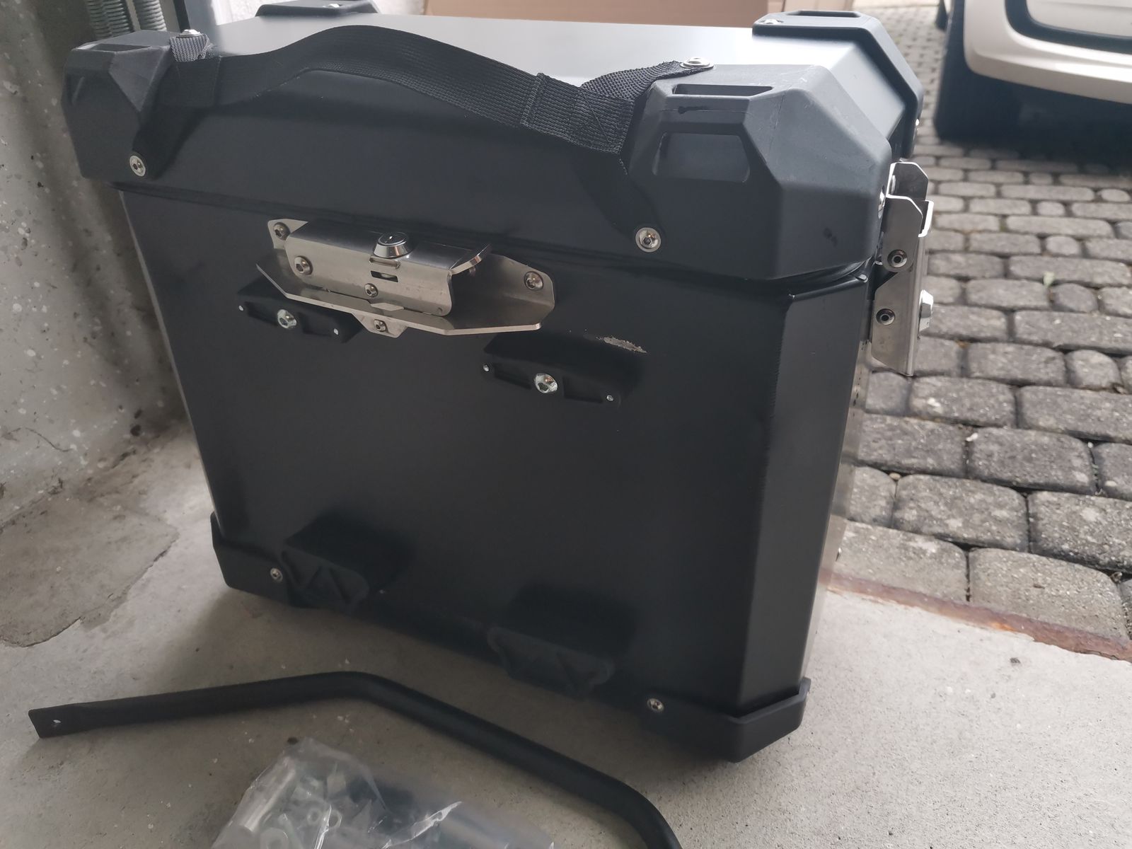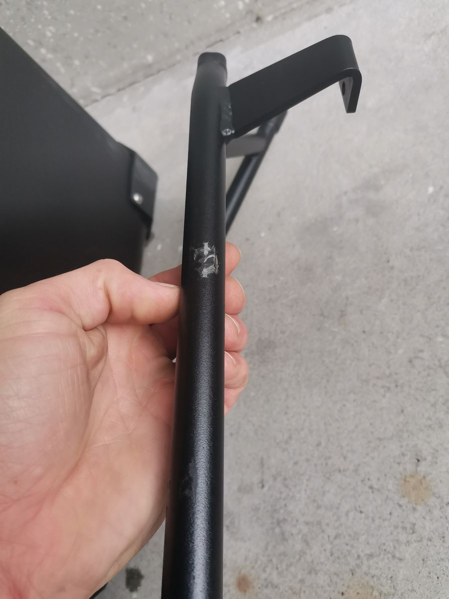 Leider hat ein Seitenkoffer durch einen kleinen Unfall einen Schaden erlitten und ist dementsprechend demoliert und verbogen.