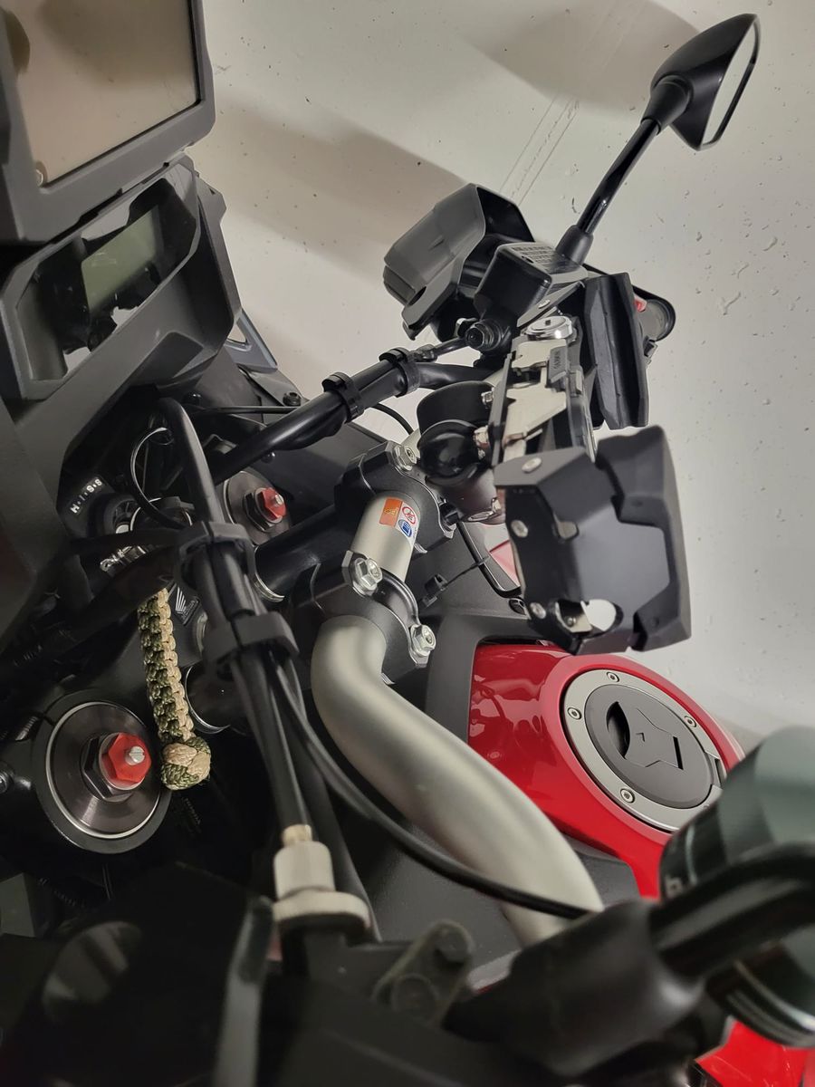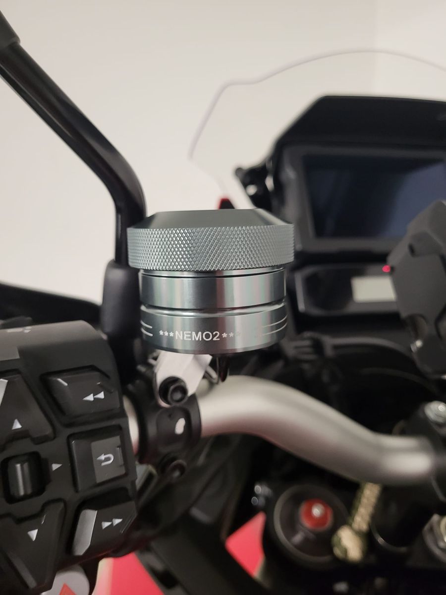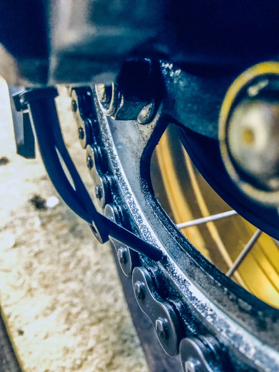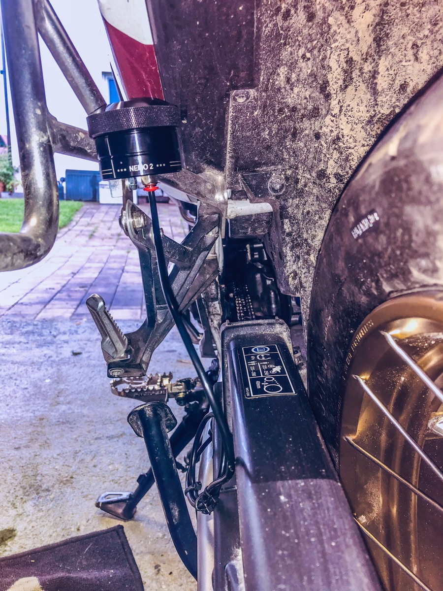 Den habe ich am Lenker links montiert, die Schlauchdurchführung gestaltete sich recht einfach. Der Sitz musste runter, dann links die Schraube lösen so das die untere Verkleidung gelöst werden konnte. Mit einem Kupferdraht 1,5mm habe ich den zusammen mit dem Ölschlauch von vorne hindurchgeschoben und dann Richtung Tank geschoben. Dann den Schlauch nach Hinten geführt mit Kabelbinder die unter dem Kunststoffkettenschlagschutz gezogen wurden und der Schlauch sitzt jetzt dort mittig.