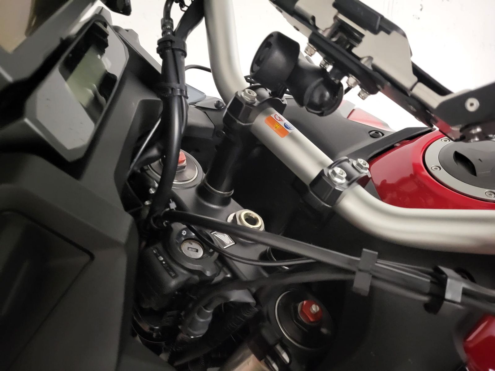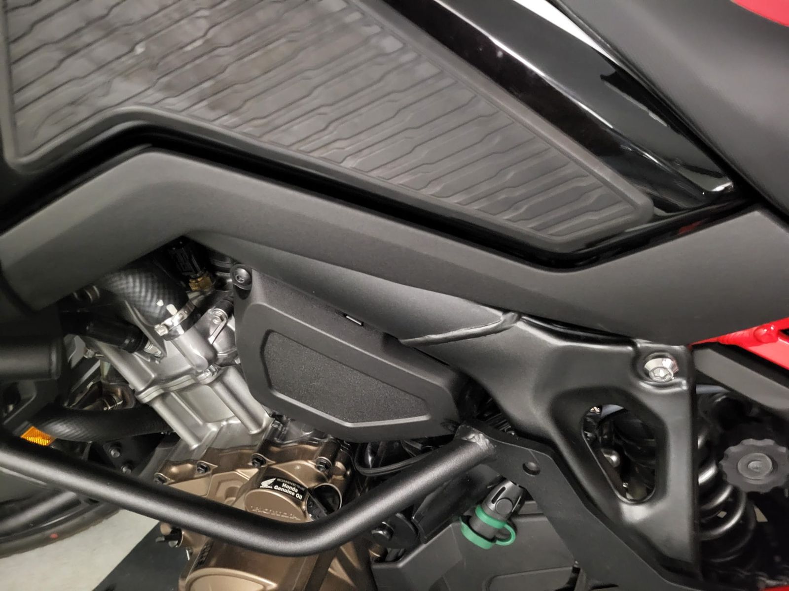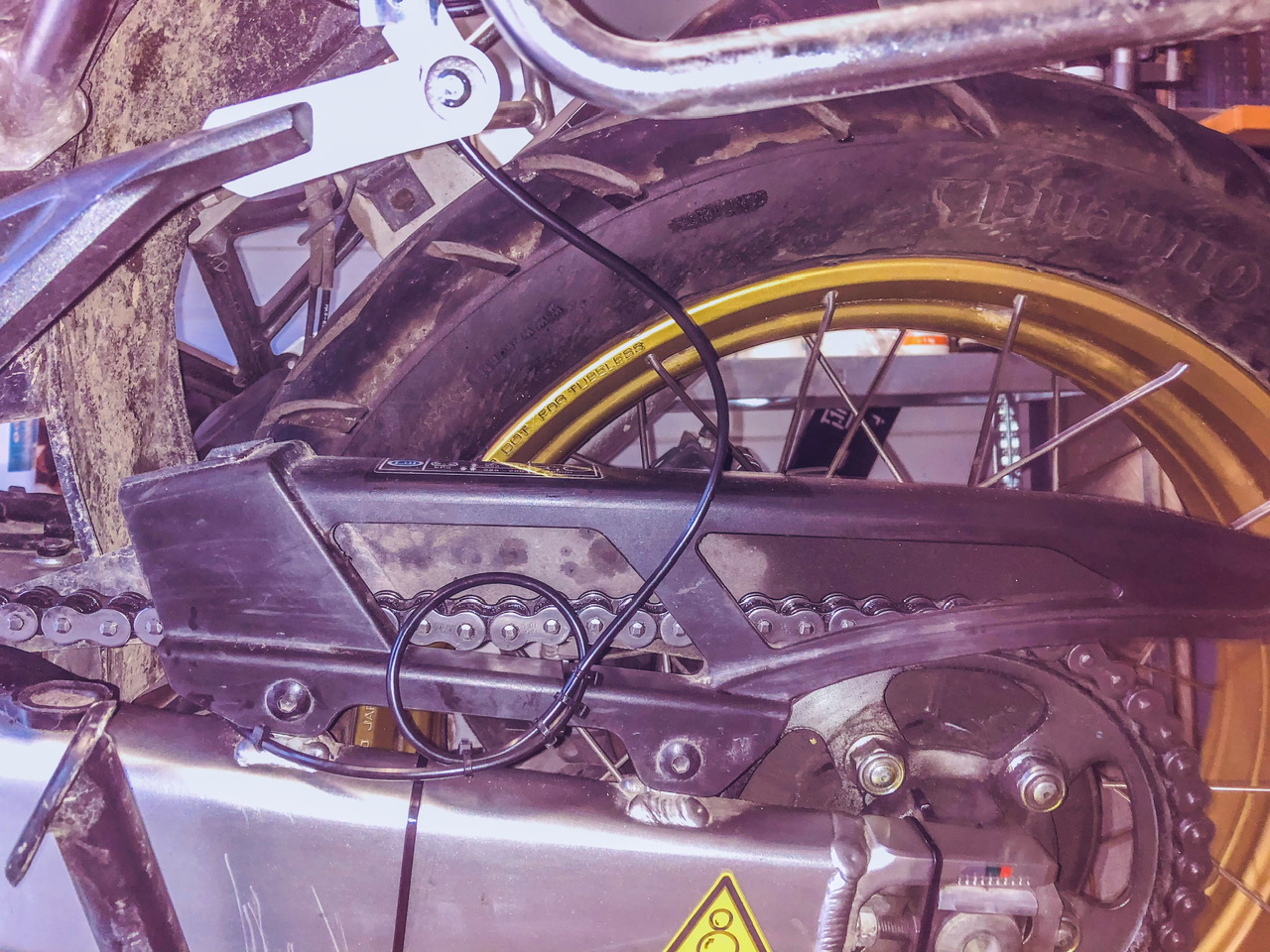 Den habe ich am Lenker links montiert, die Schlauchdurchführung gestaltete sich recht einfach. Der Sitz musste runter, dann links die Schraube lösen so das die untere Verkleidung gelöst werden konnte. Mit einem Kupferdraht 1,5mm habe ich den zusammen mit dem Ölschlauch von vorne hindurchgeschoben und dann Richtung Tank geschoben. Dann den Schlauch nach Hinten geführt mit Kabelbinder die unter dem Kunststoffkettenschlagschutz gezogen wurden und der Schlauch sitzt jetzt dort mittig.