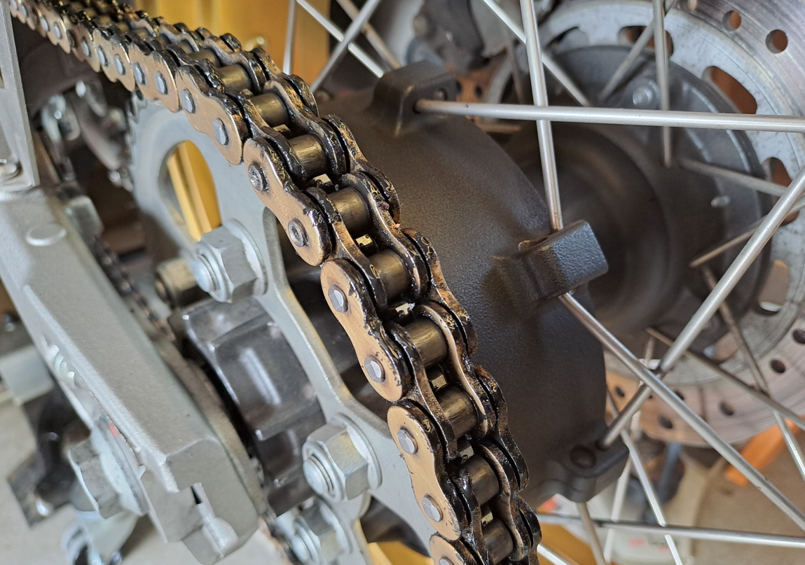 Ich höre es, wenn meine Kette trocken ist, d. h. wenn die Rollen trocken laufen - seitlich bei den O-Ringen ist relativ lang Kettenfett: bis 2.000 km.
