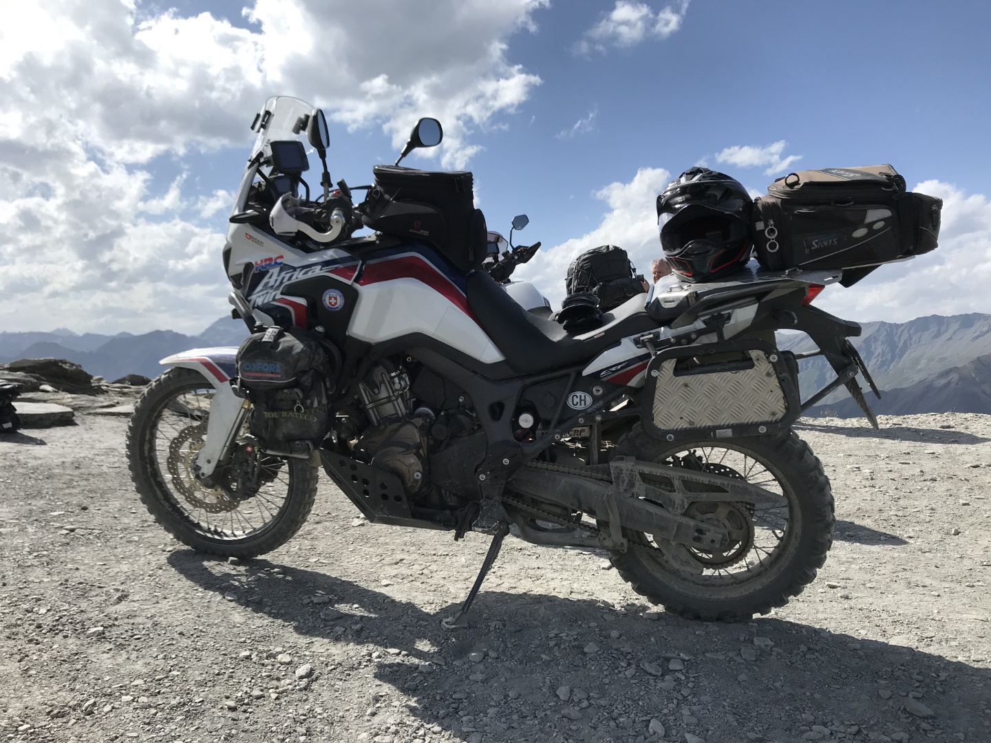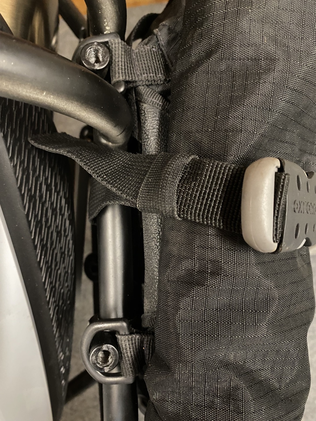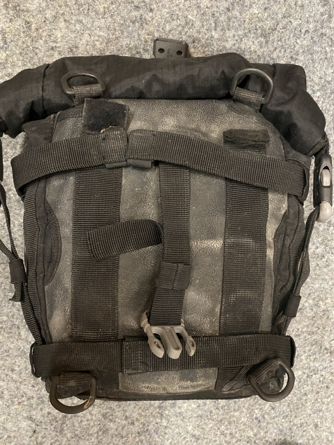 Die Bilder zeigen die Befestigung am Kofferhalter der KTM, aber an den Sturzbügeln der AT ist eine analoge Halterung montiert. Hat sich auf viiielen KM sehr bewährt, mit und ohne Schotter. Der Touratech-Riemen an der AT ist nur, damit die Dinger nicht so breit bauen und so ein bisschen enger an den Bügel gezurrt werden: