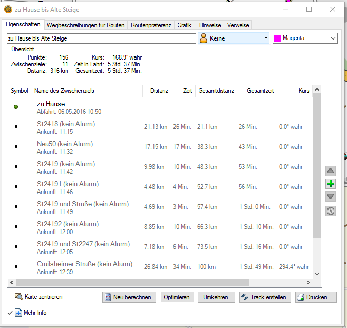 Übersicht der Fahrzeiten zwischen eines jeden einzelnen Wegpunktes (also nicht nur gesamt)