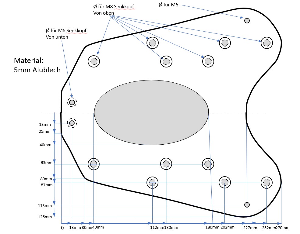 Dazu möchte ich einfach eine 5mm Aluplatte auf den Gepäckträger schrauben. Eine technische Zeichnung ist erstellt.