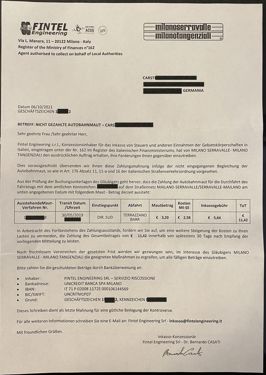 Nach 968 Tagen oder 2 Jahren 7 Monaten und 23 Tagen habe ich eine Mahnung aus Italien bekommen. ![]()
