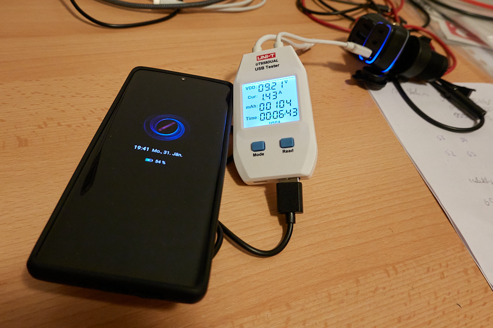 Ich habe einige 12V-USB-Stecker getestet und dazu einige Powerbanks bis ich ein Setup gefunden habe welches normal funktionieren sollte, muss sich aber erst noch im echten Leben beweisen.