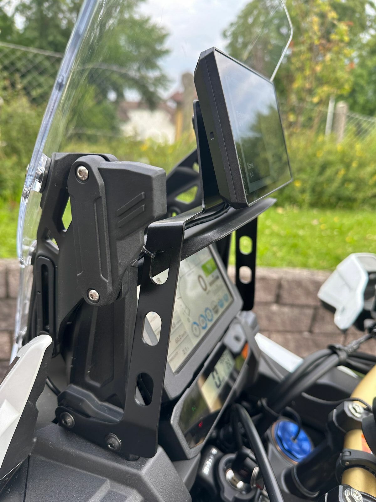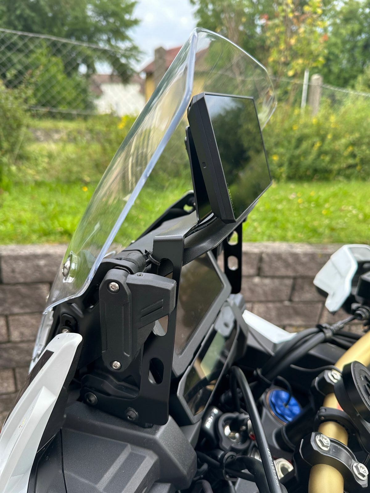 Edelstahl farbig passt für mich natürlich gar nicht, also geschliffen, grundiert, die Löcher für das Garmin Zumo XT2 gebohrt (2 Bohrer abgebrochen, das Ding ist extrem hart und stabil), dann schwarz matt lackiert (Spray Dose) und heute problemlos montiert. Sofort Probefahrt... und endlich kaum Vibrationen... kein Vergleich zu meinem bisherigen GIVI FB1178 oder dem Ali Express Graffel.
