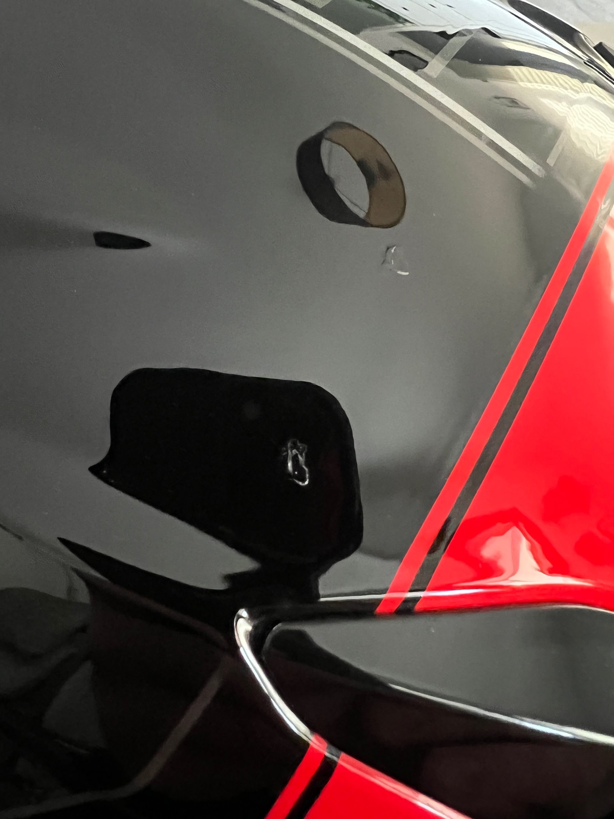 Es gibt lediglich auf der Oberseite des Helms 2 kleine Lackschäden die mit Klarlack aufgefüllt wurden. Der Helm ist Sturz und Fall frei und wurde immer pfleglich behandelt.