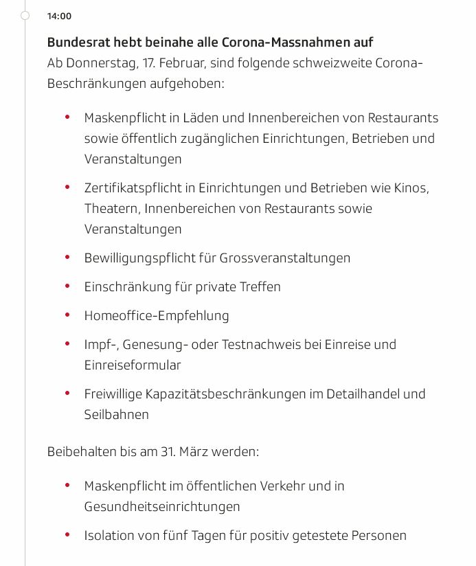 CH: Aufhebung fast sämtlicher Coronamassnahmen