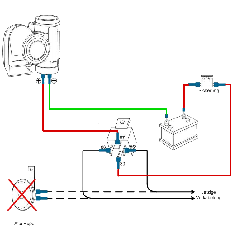 Ansteuerung von original Hupe 0,75 mm² auf Relais der Rest mit 2,5mm² verdrahtet.
