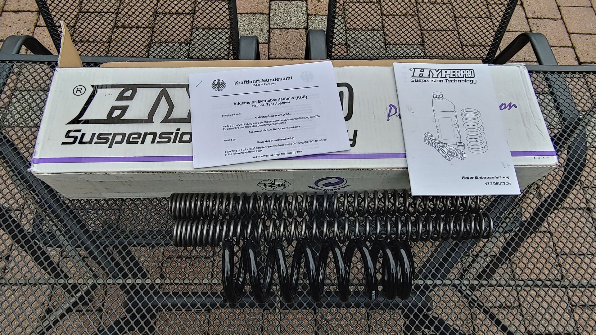 Zum Angebot gehören die drei Federn für Gabel und Federbein, die Einbau-/Bedienungsanleitung sowie die ausgedruckte ABE.