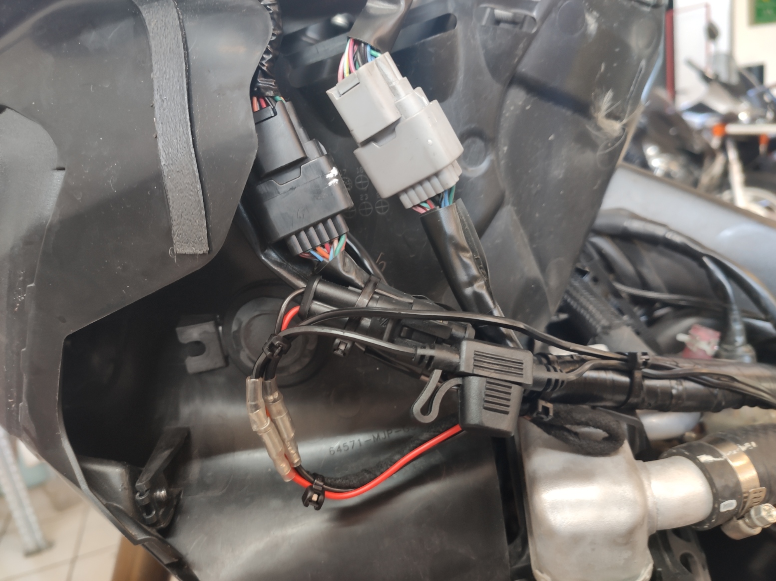 - am 2poligen hinter der linken Verkleidung ( normalerweise für den Anschluss der KFZ Dose gedacht )