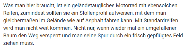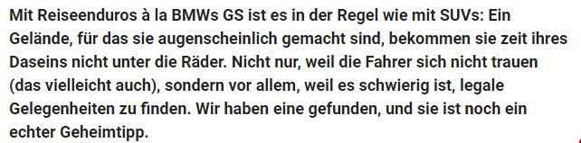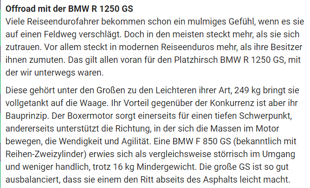 das mit dem Boxer kann ich bestätigen. In jungen Jahren hatte ich an einem WE im Motopark Hechlingen ein Training gebucht und bin eine 1150GS gefahren. Das ging super, die anderen Mitfahrer, die sich "nur" eine F650 wegen des Gewichtes genommen haben, hatten wesentlich mehr Probleme.