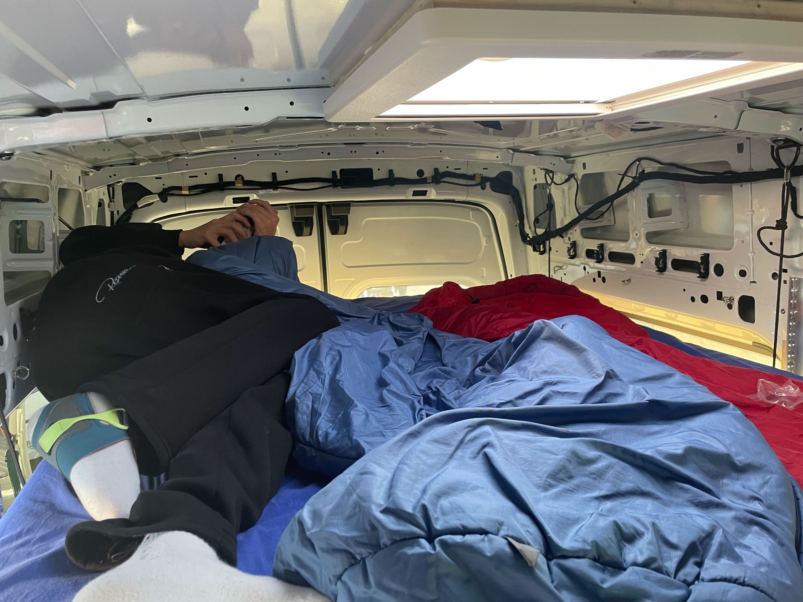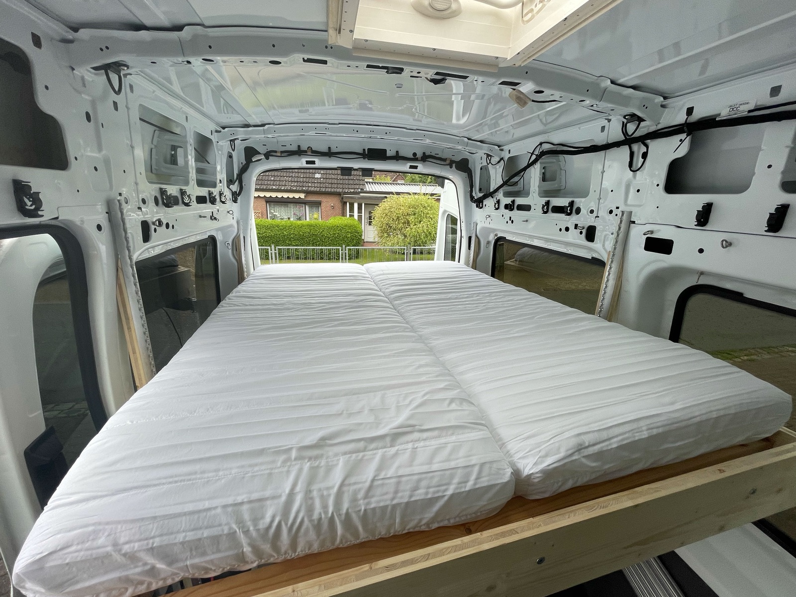 Selbst in über den verladenen ATs bleibt eine Schlafnische von etwa 55 cm (noch ohne Dämmung und Dachverkleidung, also später netto etwa 50 cm. Das klingt nicht viel, ist aber absolut bequem und ausreichend.