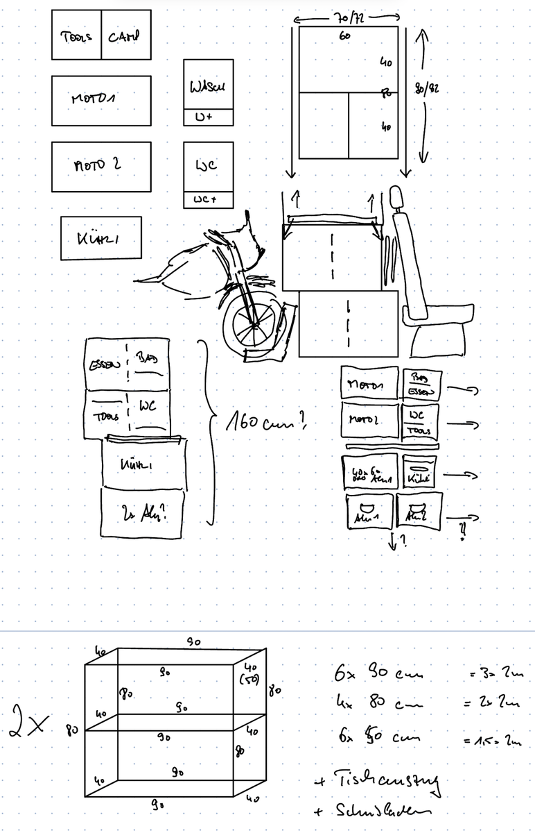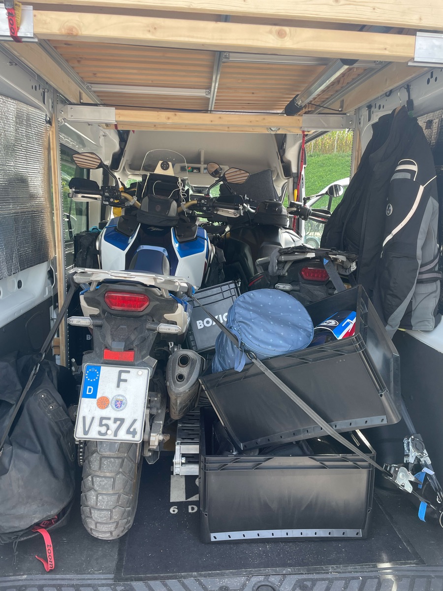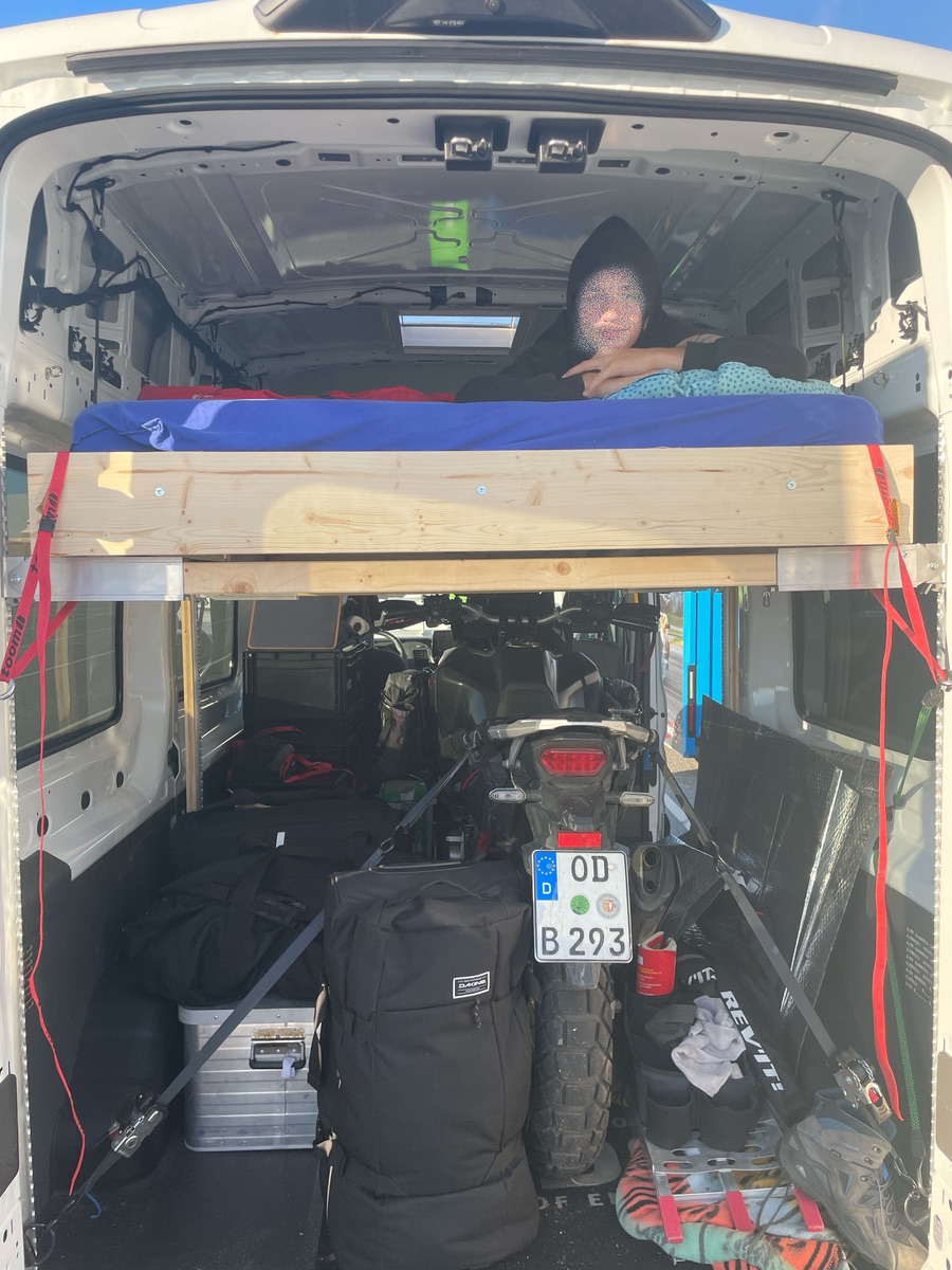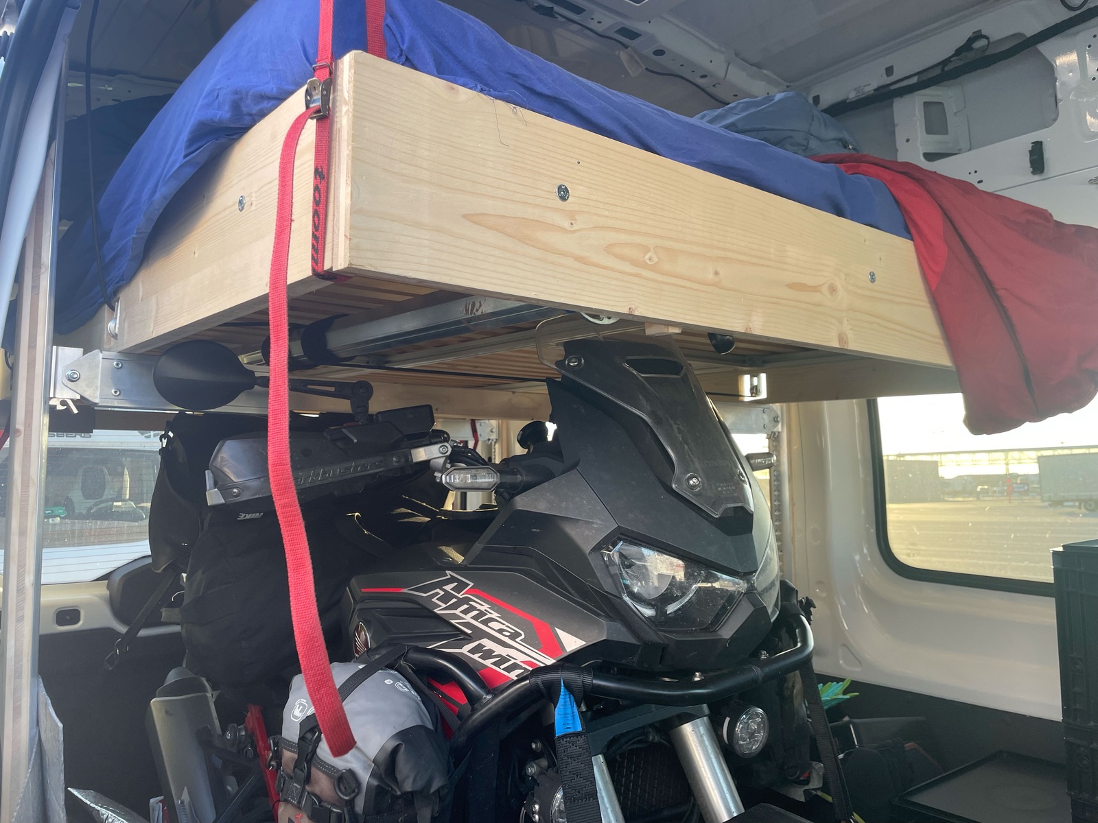 Sinn des ganzen ist ja, dass ich das Bett in einer Transportstellung (ganz oben), in einer Schlafposition über den verladenen Motorrädern (2/3-Höhe) oder in einer tieferen Camping-Höhe bei ausgeladenen Mopeds arretieren kann. Und was soll ich sagen: das klappt ganz wunderbar!