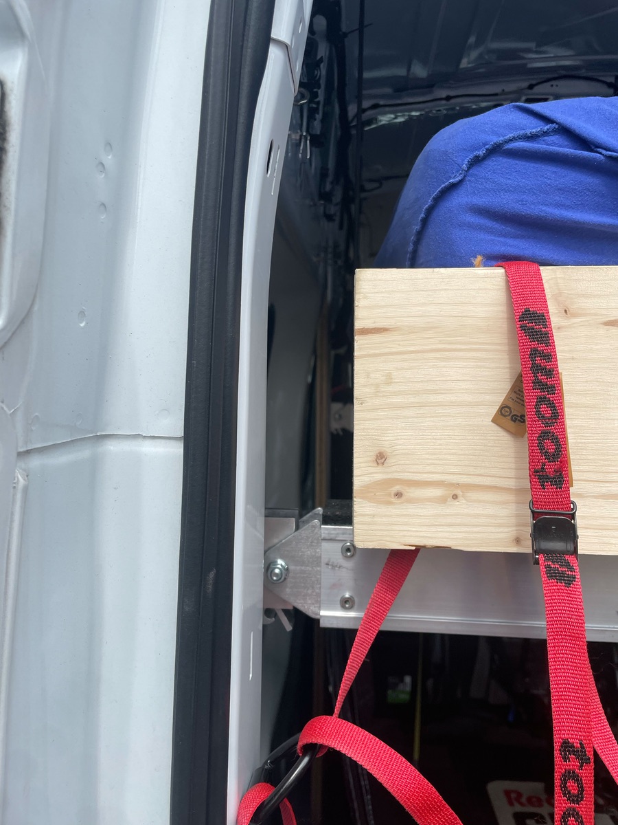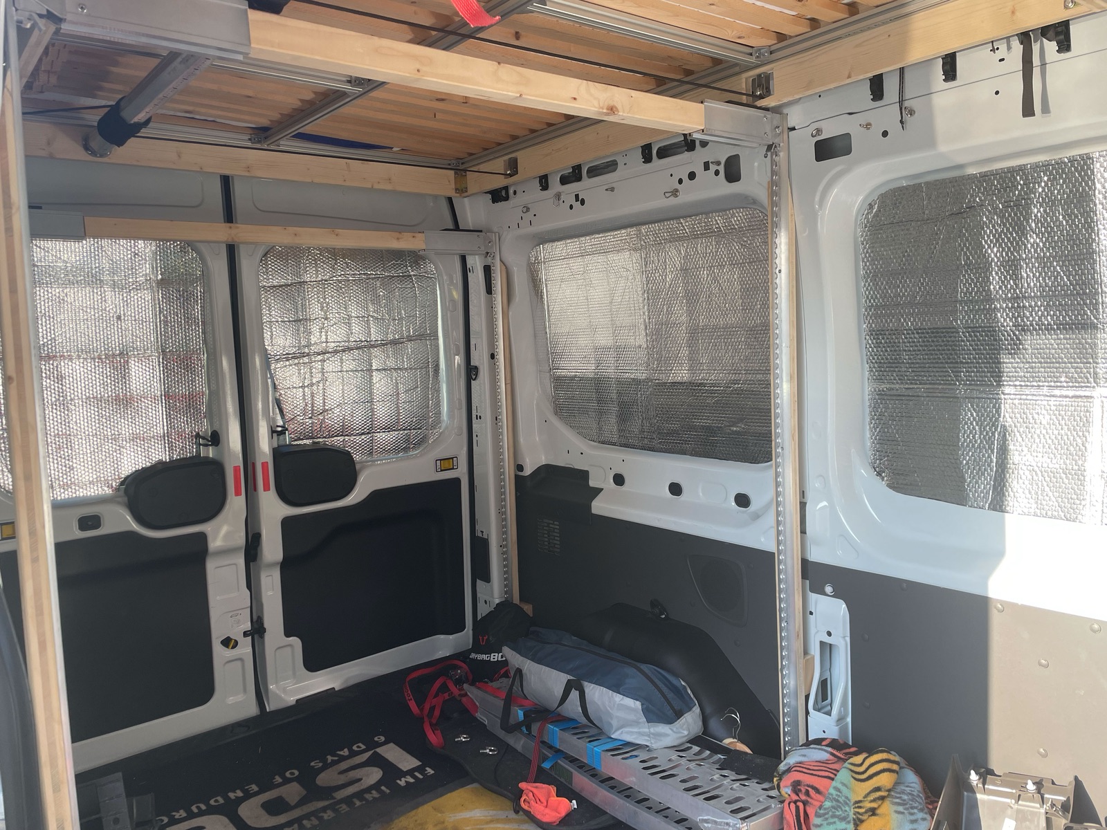 Im Prinzip habe ich vier Holzlatten beidseitig senkrecht an der C- und D-Säule verschraubt. Zum Glück kamen viele Löcher im Blech zutage, als ich den Himmel und die Wandverkleidungen des Transits herausgenommen habe. Dort habe ich an den entsprechenden Stellen EInnietmuttern eingezogen und die Latten mit Gewindestäben und Kontermuttern verschraubt. Auf den Holzlatten sind Airline-Schienen verschraubt. Alles trägt die Last auf den Fahrzeugboden ab und hält sehr stabil.