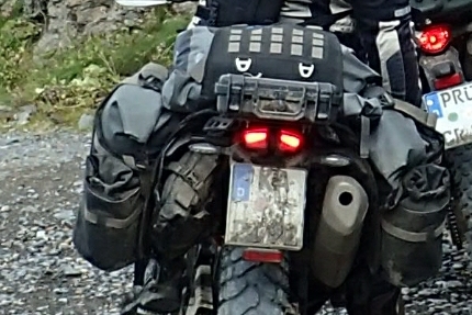 Hast Du einen Traeger montiert? Wenn nicht, sitzen die Seitentaschen auch fest, wenn es etwas rauer wird? Auf meiner KTM sitzt das 80er System erst gut, seitdem ich Abstandhalter drunter habe. Bei der AT koennte es mit dem einseitigen Schalldaempfer ja aehnlich sein ...