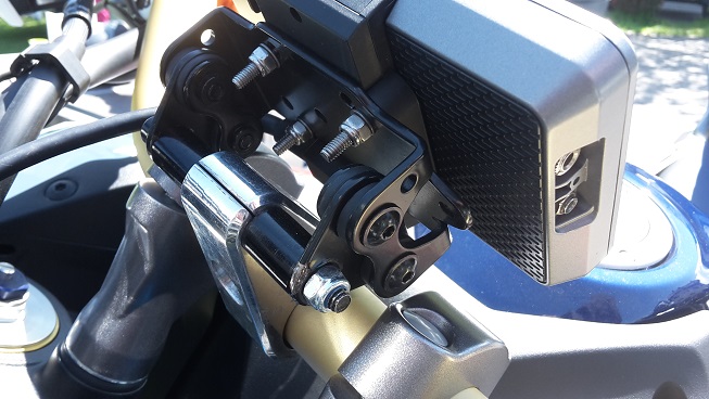 zwei kleine Alustreben zwischen Verkleidung und der Strebe hinter der Scheibe. Es wackelt weder die Scheibe noch das Navi. Habe die Puig Tourenscheibe mit MRA Spoiler montiert und TomTom Rider 410 mit GS Halterung inkl. einer Adapterplatte, damit ich das Navi auch um 90 Grad drehen kann, dabei wird nichts verdeckt. Navi lässt sich auch abschließen.