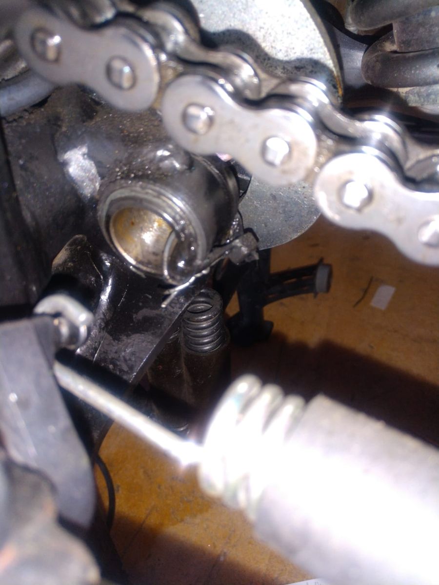 Jetzt während des Winters habe ich mir insb. mal die Räder / Felgen vorgenommen (das altbekannte Speichenproblem: hätte ich die Maschine im geputzten Zustand und Hellen gesehen, hätte ich sie stehenlassen, aber sei`s drum) und nach dem Ausbau des Hinterrades mich über die Aufnahme des Hauptständers gewundert.