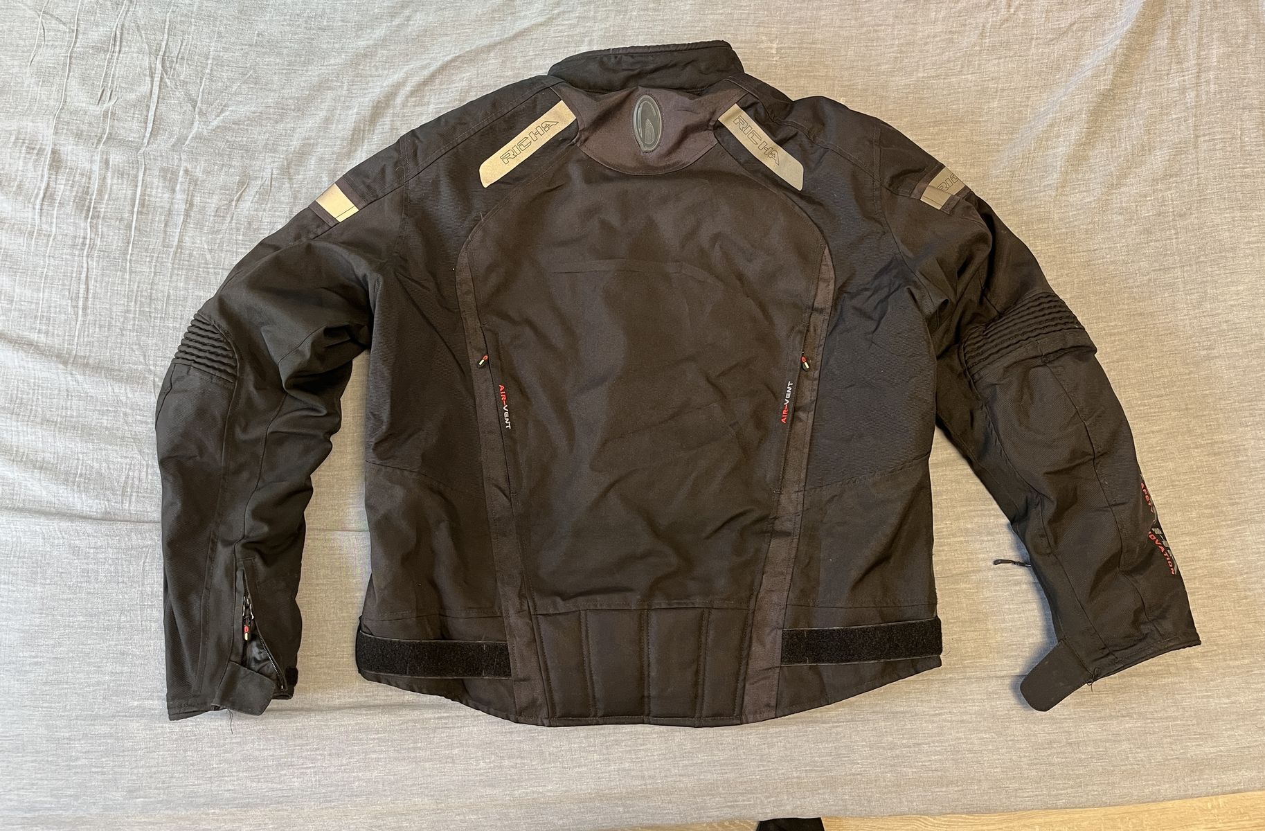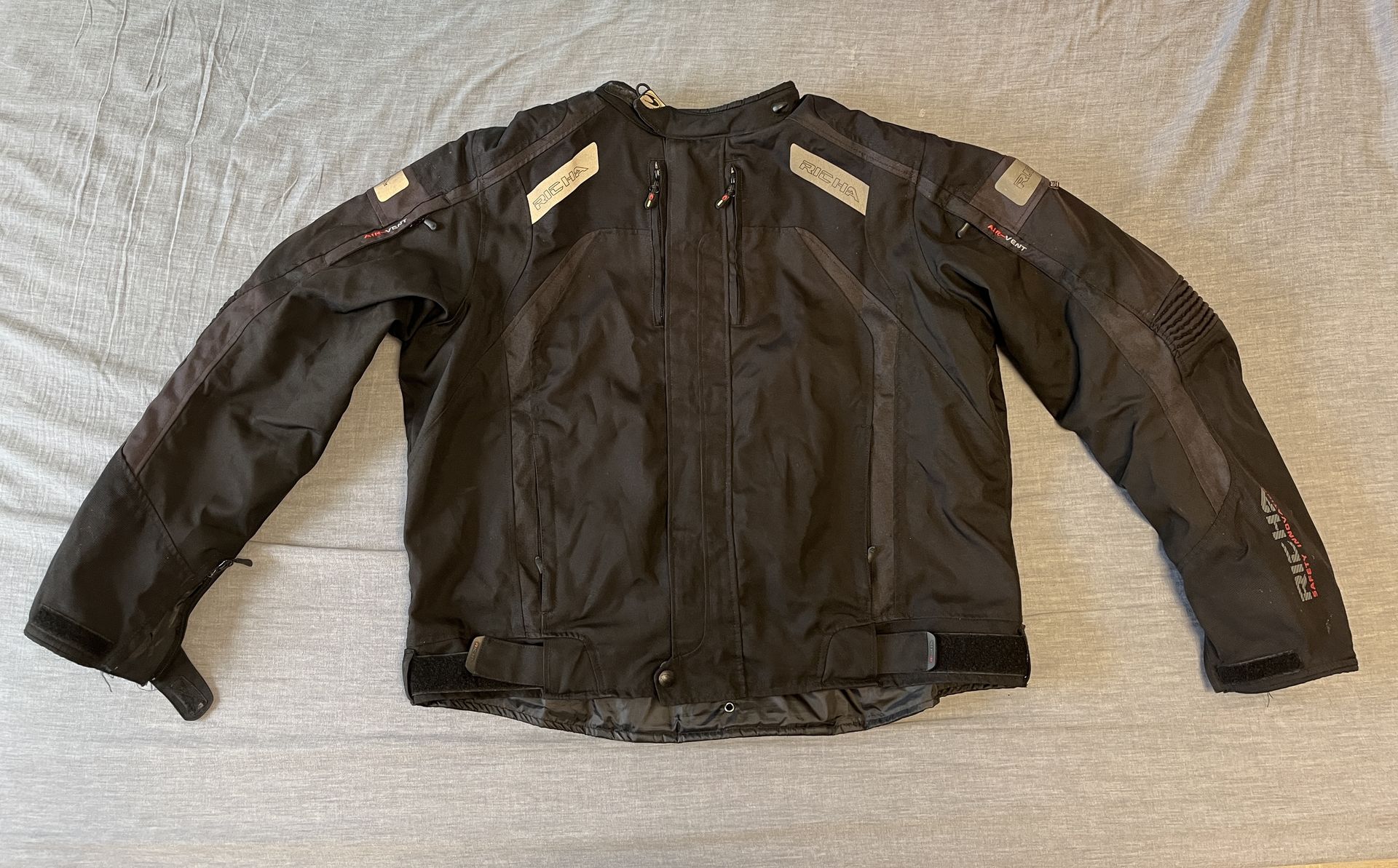 Sehr gut erhaltene Motorradjacke der Firma RICHA. Es sind Ellbogen-, Schulter- und Rückenprotektoren verbaut. Durch die per Reißverschluß zu öffnenden Lüftungsfächer auch gut im Sommer fahrbar. Die Jacke besteht aus atmungsaktiver und wasserdichter Membrane.