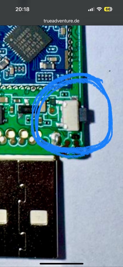 #179 Alles anzeigent00thl355: alles was du sagst stimmt. Der Schalter ist nicht durch ein Loch im Gehäuse zugänglich. Ich vermute, er dient dazu irgendeine Grundeinstellung vorzunehmen. Andererseits Ist der Schalter mit zwei Anschlüssen mit der Platine verbunden. Nur mal angenommen, er ist im Zustand eingeschaltet und es fließt beim einsprühen Lack in den Schalter und unterbricht den Stromfluss. Dann würde der Dongle nicht mehr korrekt funktionieren.