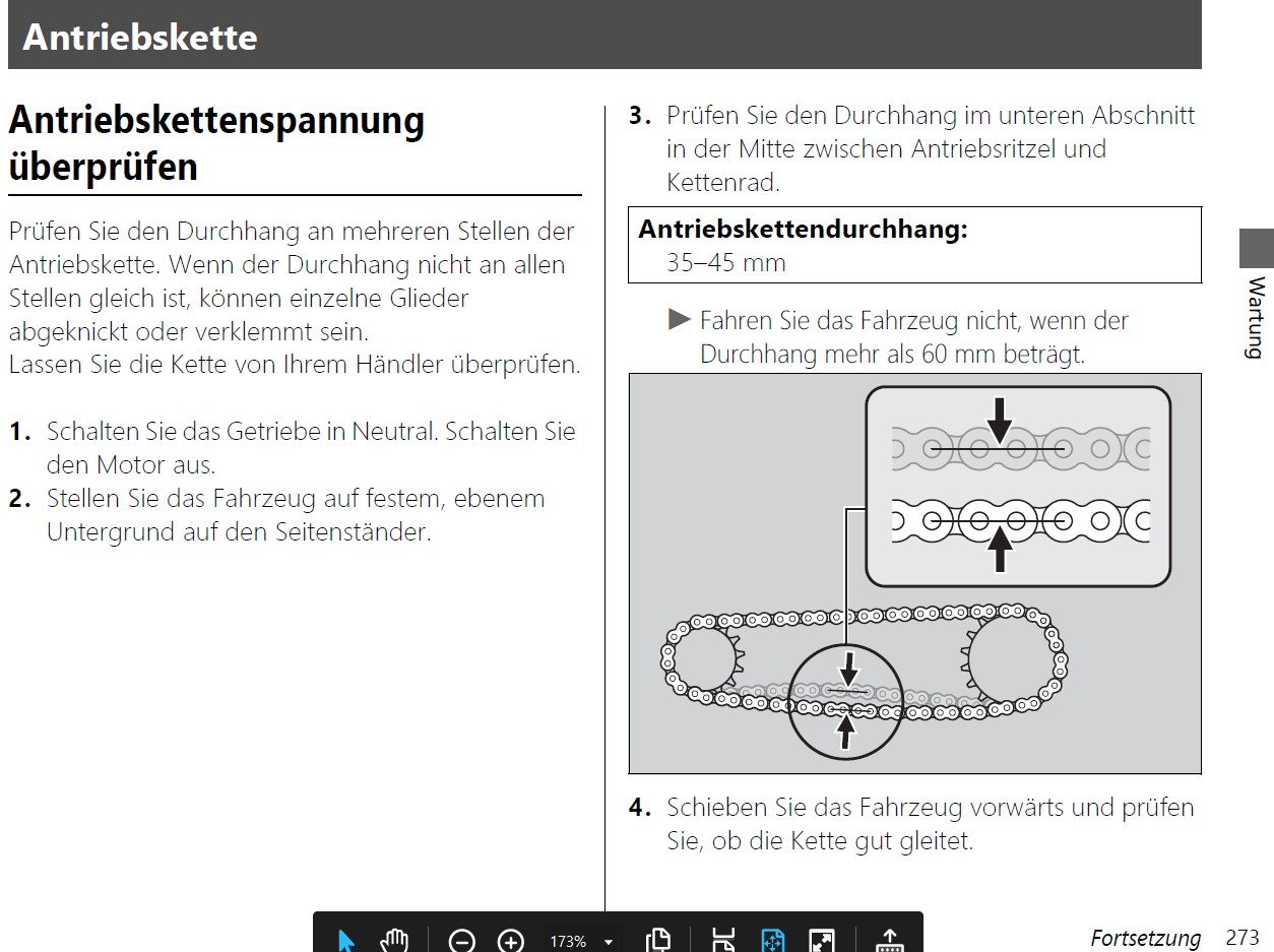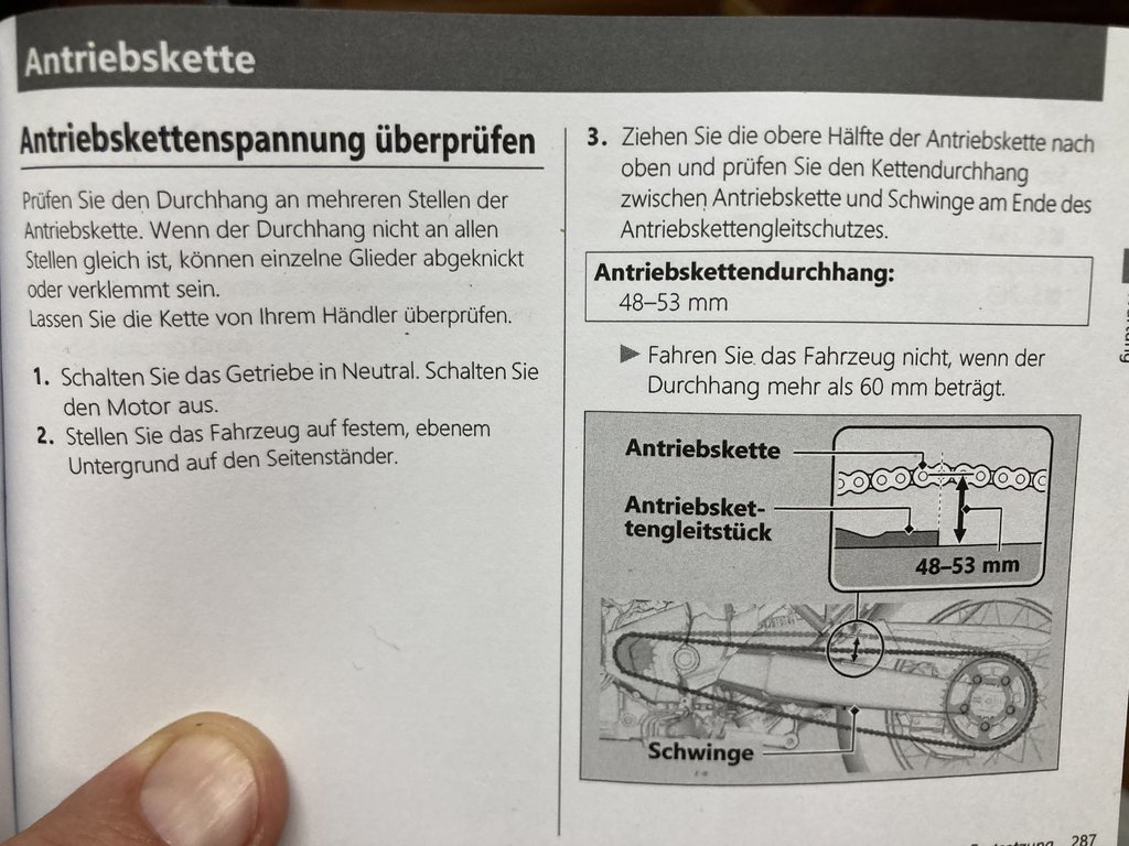 Im August 2020 habe ich das Handbuch von der offiziellen Honda-Seite heruntergeladen - das PDF = 100% die gleiche wie die o.g. gedruckte Version. Und das steht auf Seite 273 folgendes zum Kettendurchhang: