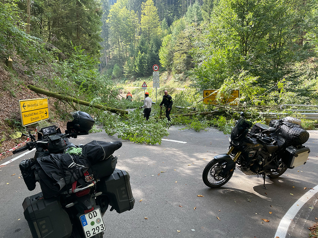 ... im Schwarlzwald sind wir letztes Jahr über viele KM die schönsten (gesperrten) Kurven gefahren, bis wir auf zwei polnische Waldarbeiter stießen. Der erste winkte uns zu und hielt uns auf, bis der Baum quer über der Straße lag und dann haben sie uns noch eine Schneise durch die Stämme gesägt, damit wir passieren konnten.