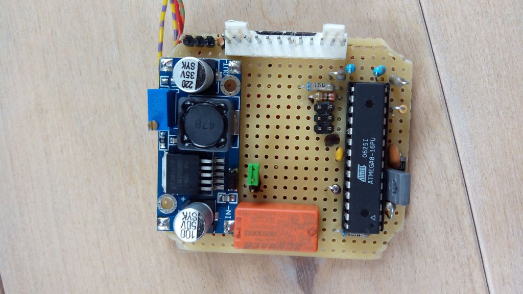 Da ich die Steuerung für den Kettenöler mit Integrieren wollte habe ich das ganze noch mal neu auf einer Lochrasterplatine zusammengelötet.