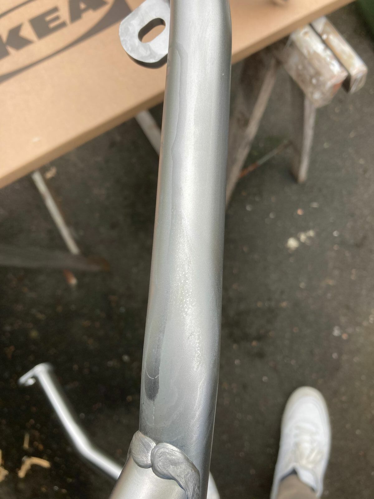 Eines der Rohre hatte beim Schweißen ordentlich einen verbrutzelt bekommen. Das sieht schlimm aus, kann man aber reinigen.