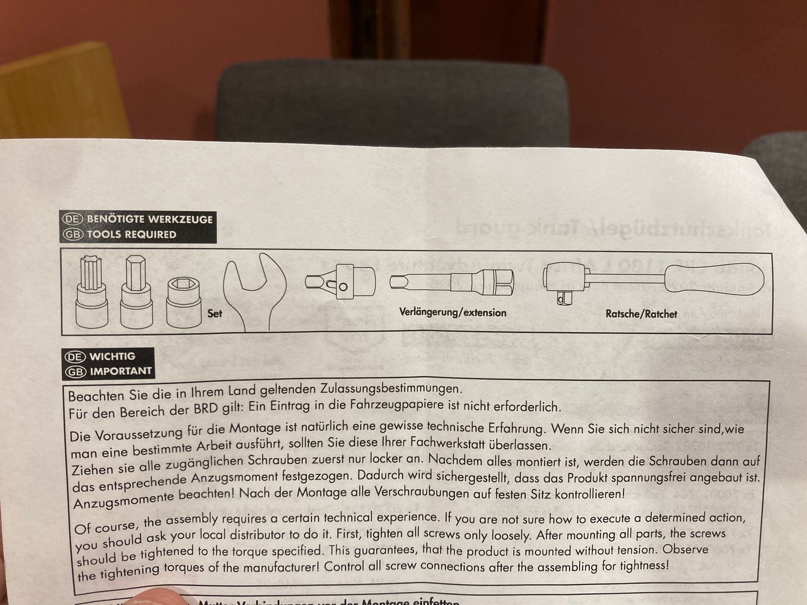 Nach Sichtung der umfangreichen Anleitung ( 2 Seiten ) so wie den darauf abgebildeten Werkzeugen, habe ich mich recht siegessicher an die Montage begeben. Man beachte, wir benötigen ein Set je Torx, Inbus, Sechskant sowie Maulschlüssel. Spätesten an dieser Stelle, spätesten hier hätten die Alarmglocken läuten können. Es war nix zu hören, also weiter gehts.