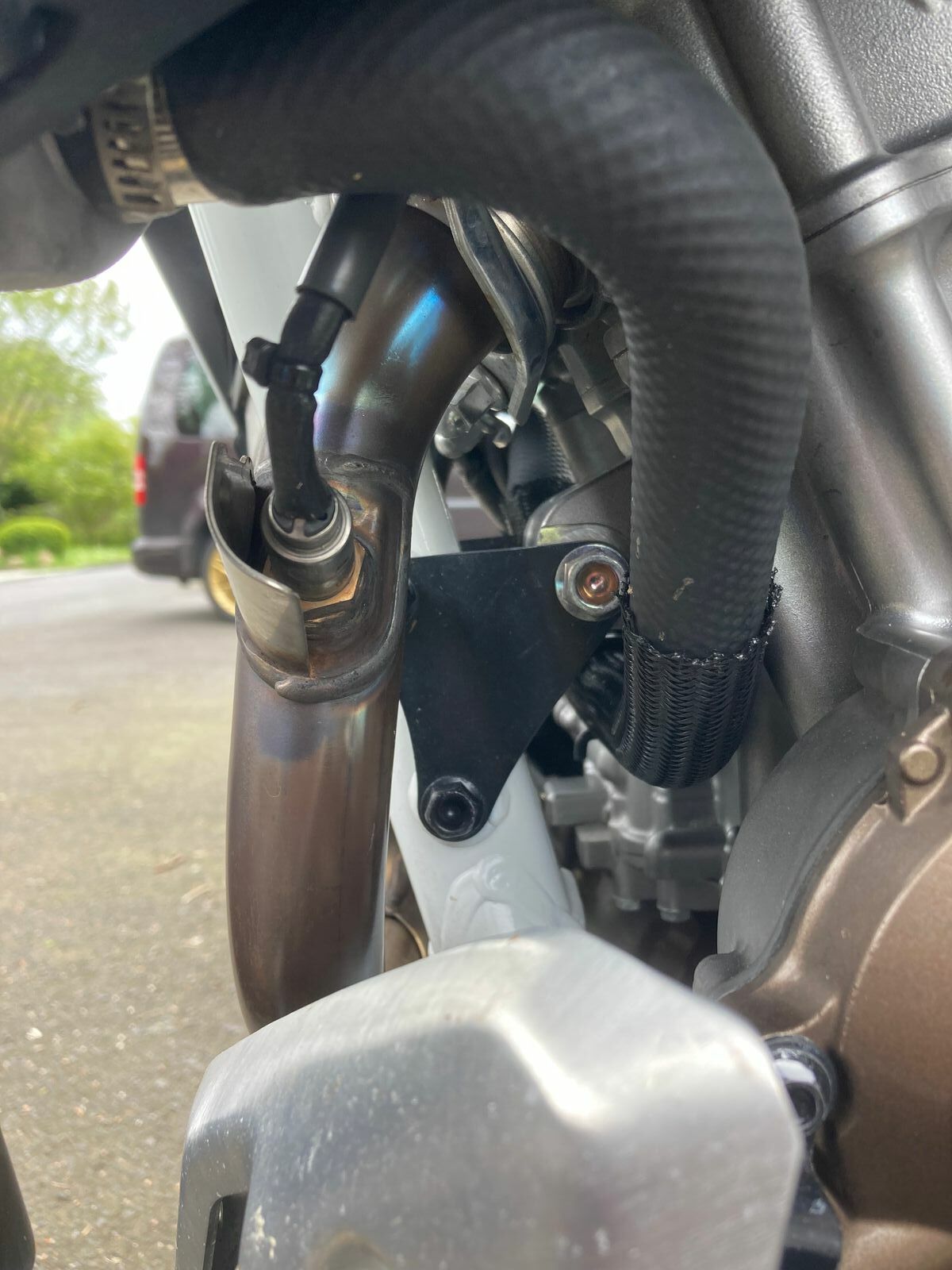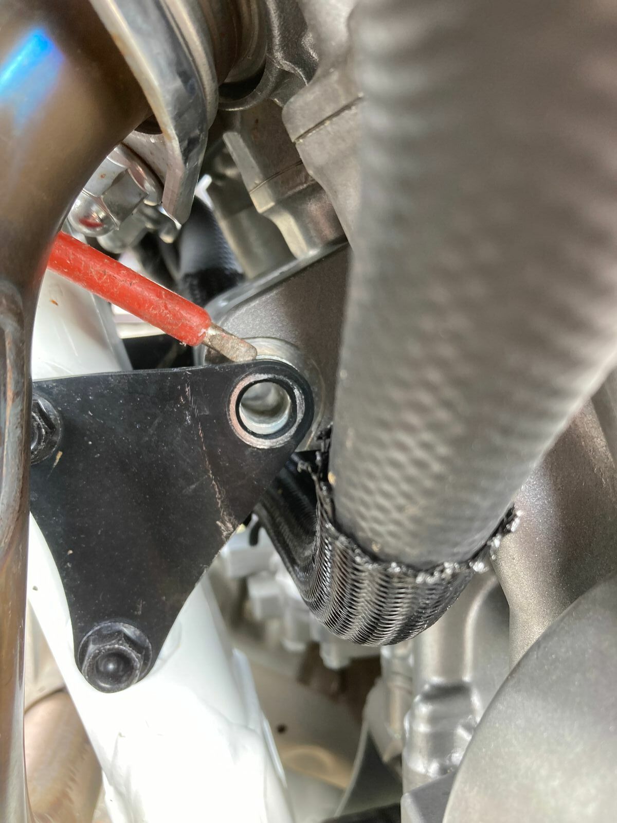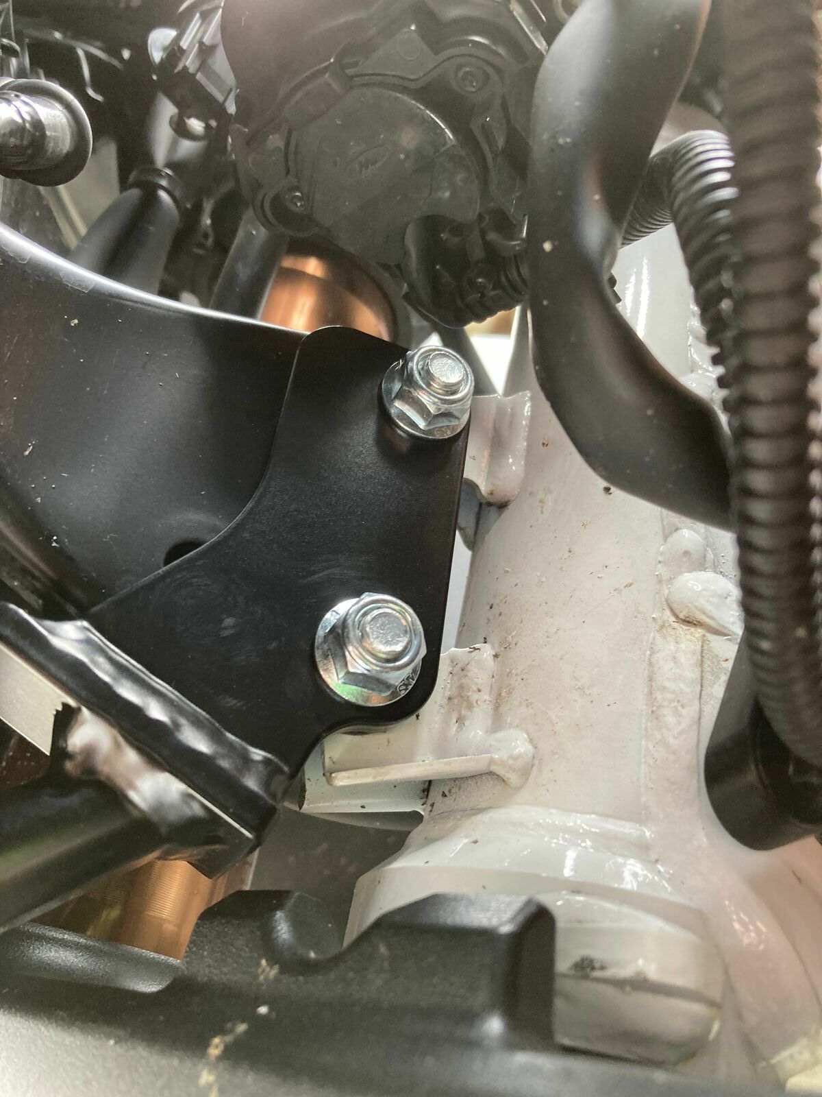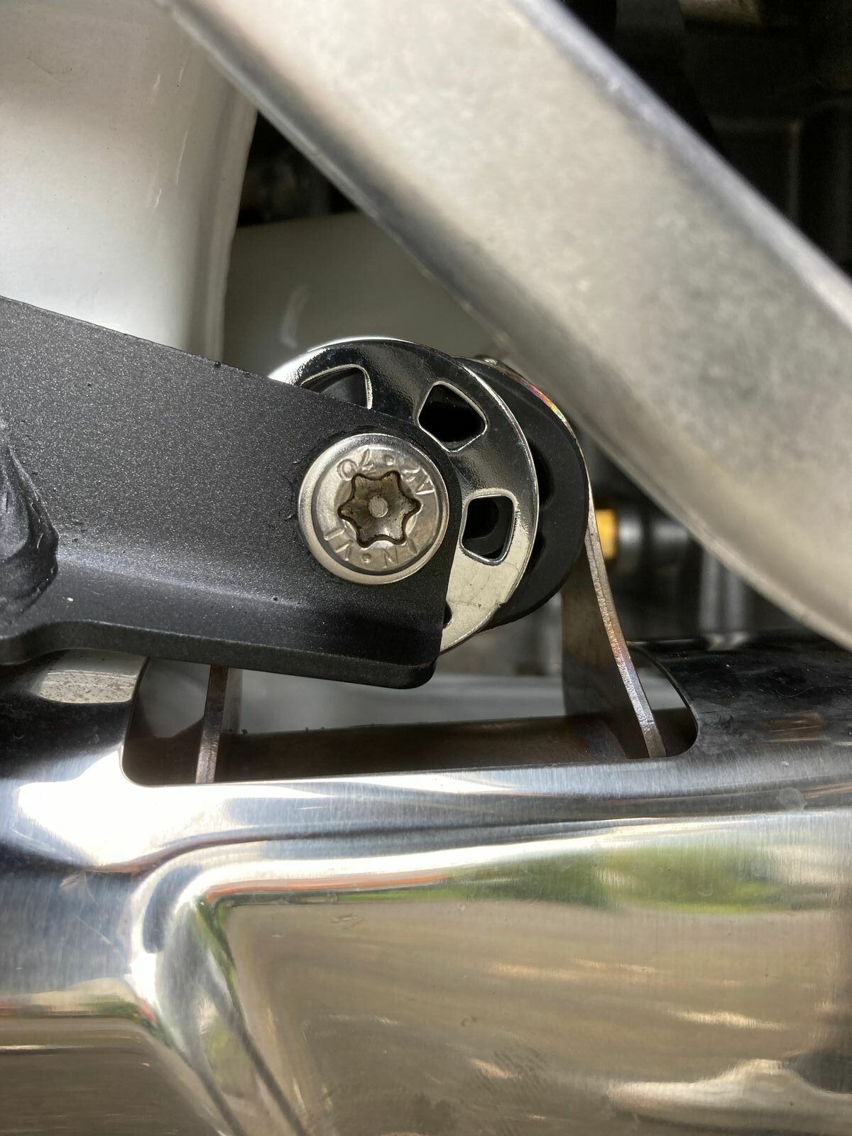 Hinter der Halterung sitzt eine dickere Distanzhülse. Da dort recht wenig Platz ist, habe ich sie mit einem Schraubendreher eingeklemmt damit sie beim Einfädeln der Schraube nicht runter fällt