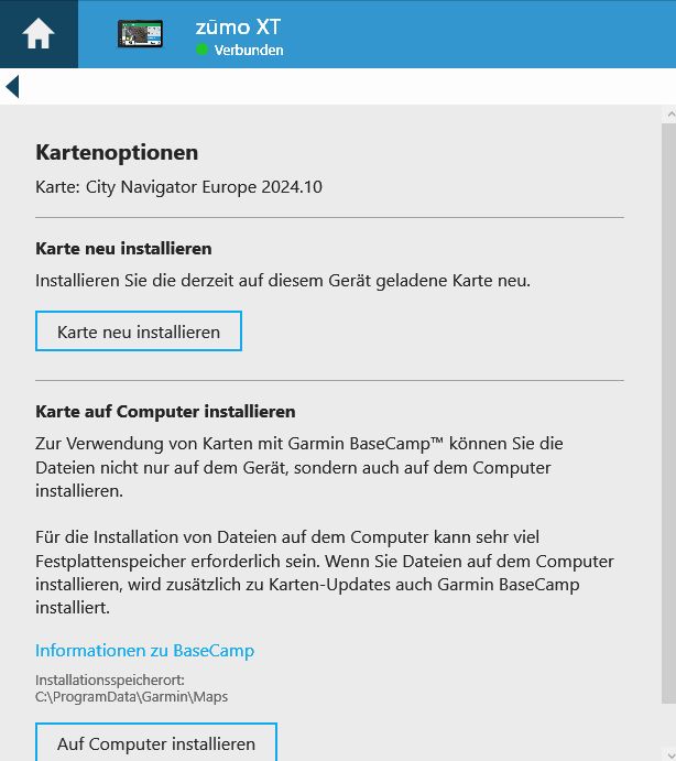 Nachdem ich auf Basecamp mit den bereits installierten 2024.10er Karten eine Tour geplant hatte wollte ich die Route auf das Zümo übertragen. Jedoch erschien beim übertragen der Hinweis, dass die installierten Karten nicht mit dem des Zümo übereinstimmen, obwohl beides dieselbe Version ist.