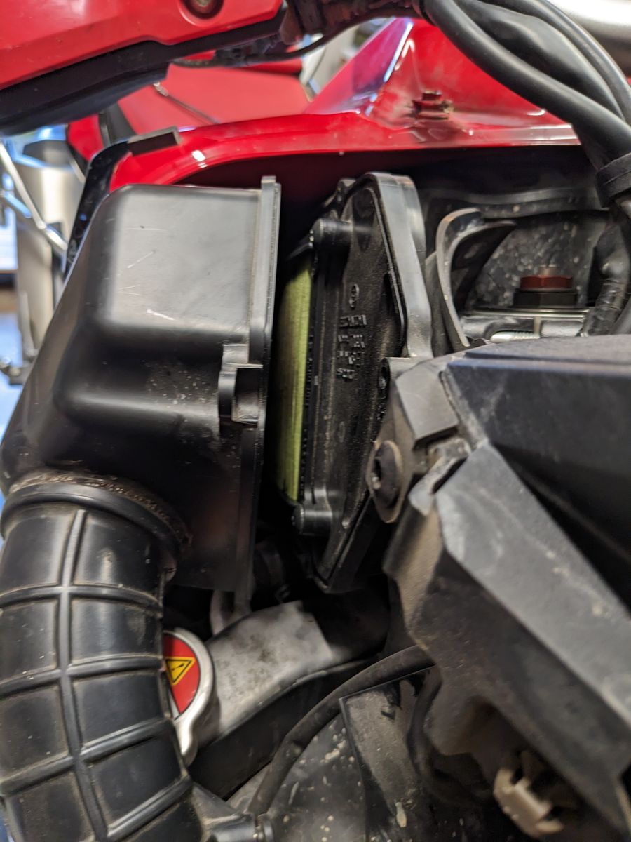 Was habe ich gemacht: Die Seitenverkleidung ist weg, die 3 Schrauben am Luftfilterkasten sind gelöst, der Kasten ist jetzt auch locker und müsste den eigentlich rausziehen können. Aber ich krieg den ums verrecken