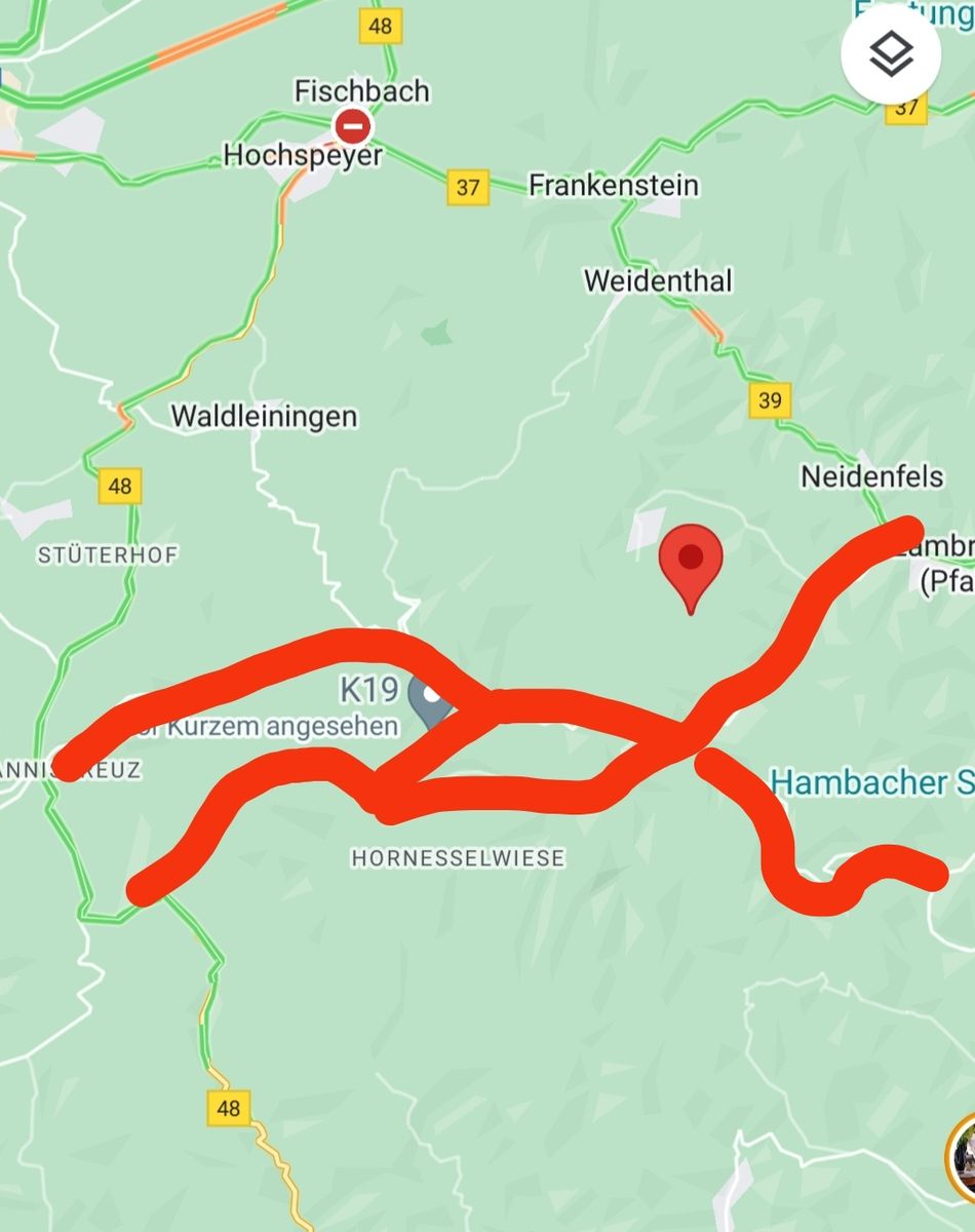OK, war schlecht erklärt. Bin von der B48 auf die L504 Richtung Waldleiningen. Da ist frei.