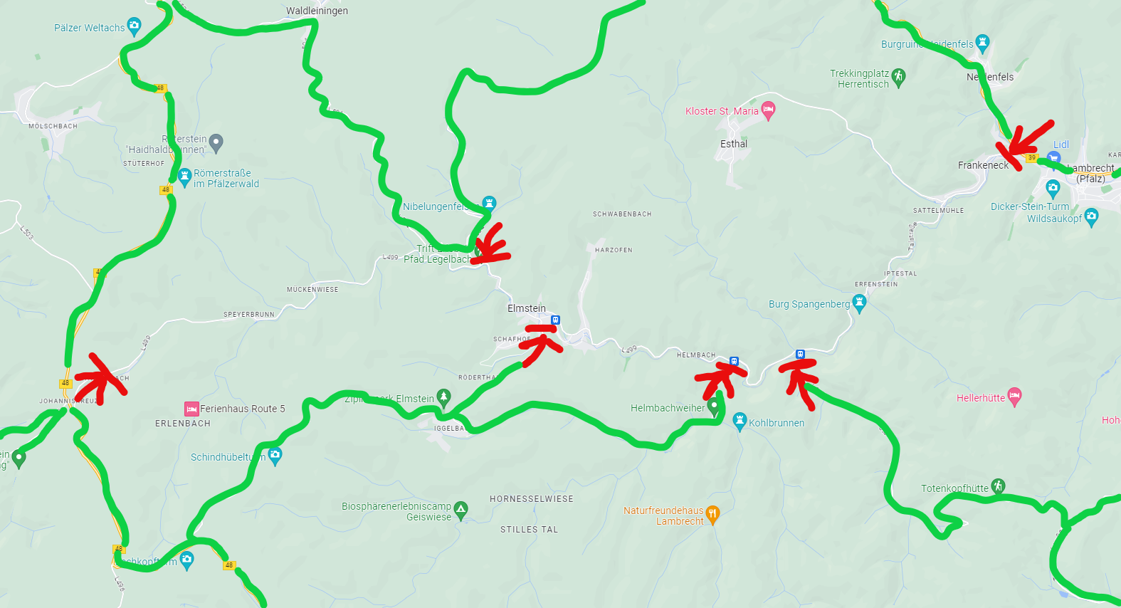 Sollte dort auch kein Verbotsschild stehen, so wäre eine Tour vom Kreuz kommend über die K58/ K17 bis nach Iggelbach und dann rechts runter bis nach Helmbach auf die L499 problemlos machbar. Und dann links ab durch Elmstein durch bis an die Abzweigung zur L504 nach Waldleiningen hoch und dann weiter zur B48 hoch.