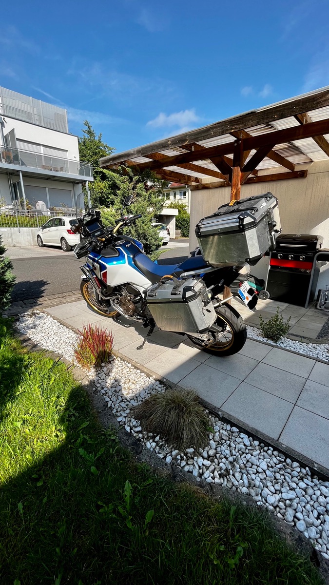 - Das Alu-Topcase (Outback 58l ist von GIVI mit separatem Schlüssel; es passen 2 Helme rein)