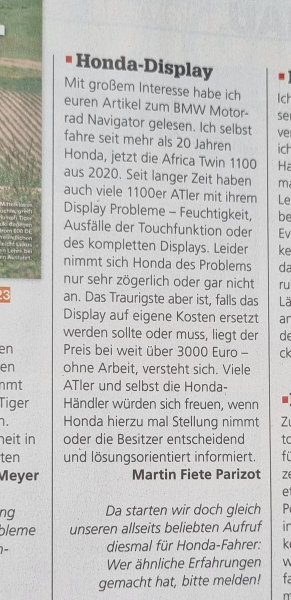 Trotzdem, bitte schreibt unter: post@motorradnews.de Eure Erfahrungen diesbezüglich mit Hinweis Display Probleme Africa Twin.