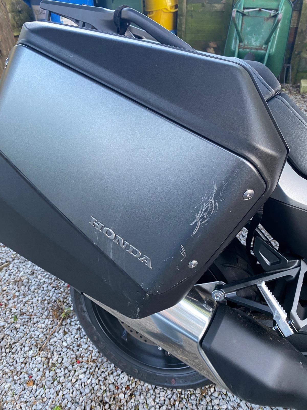 Hallo! Ich möchte gerne die Verkleidung an meinem Koffer auf der rechten Seite wegen Kratzern austauschen. Honda verkauft diese nur paarweise für etwa 200 Euro. Hat vielleicht jemand Bedarf an der linken Verkleidung? Dann könnte man sich die Kosten teilen. Die Farbe des Motorrades ist Matt Iridium Gray Metallic.
