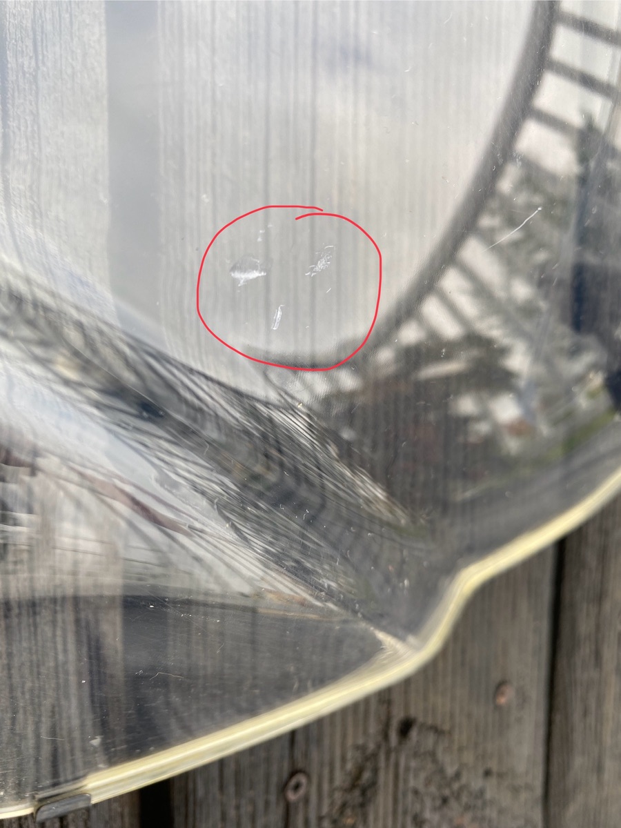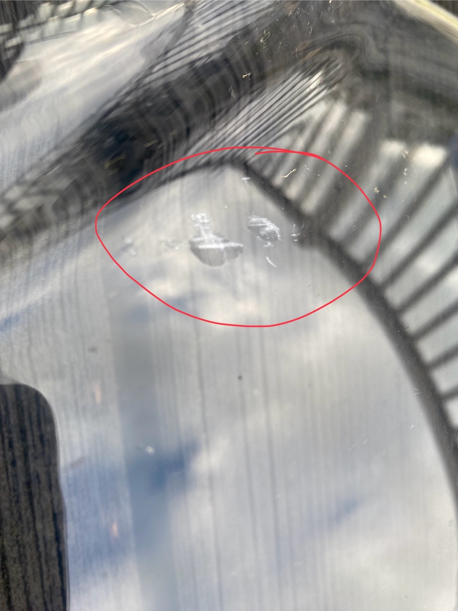 Die Scheibe ist gebraucht, entsprechend hat sie auch Gebrauchtspuren. An zwei Stellen sind kleine Beschädigungen auf der Innenseite, sie stammen vom Navihalter. Die Stellen befinden sich nicht im Sichtbereich.