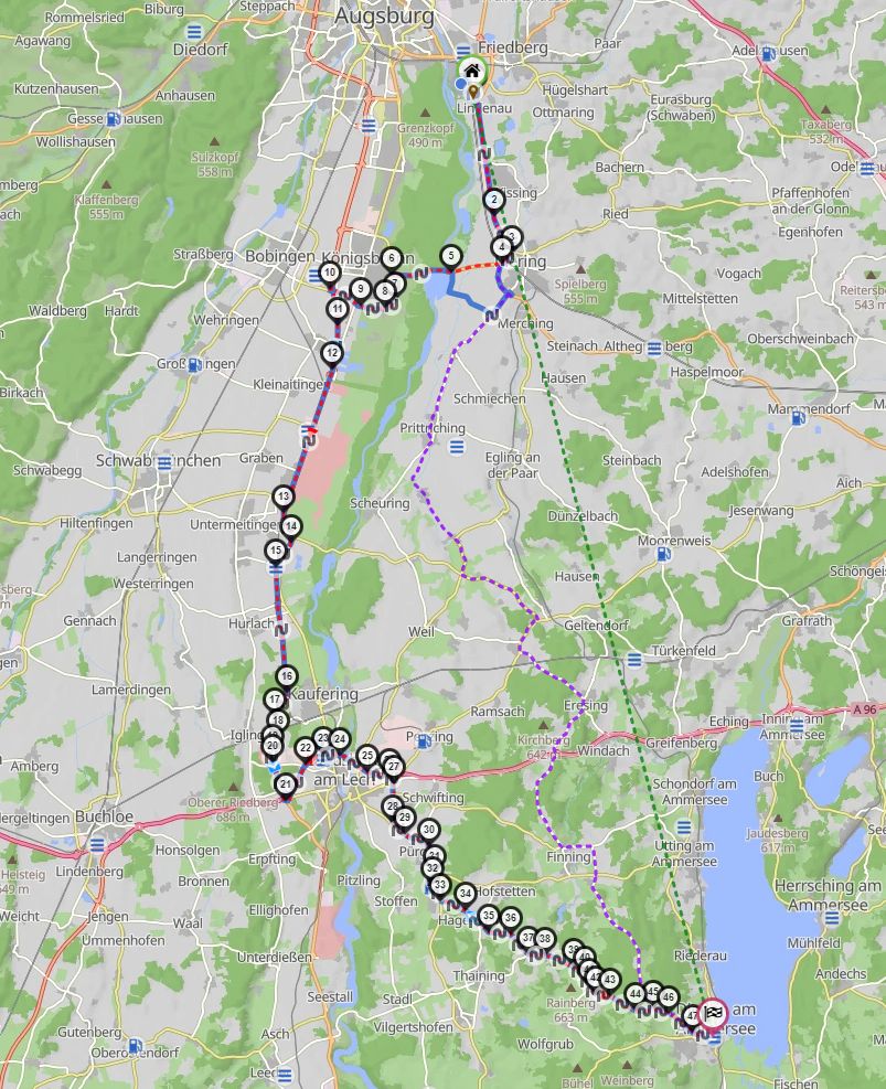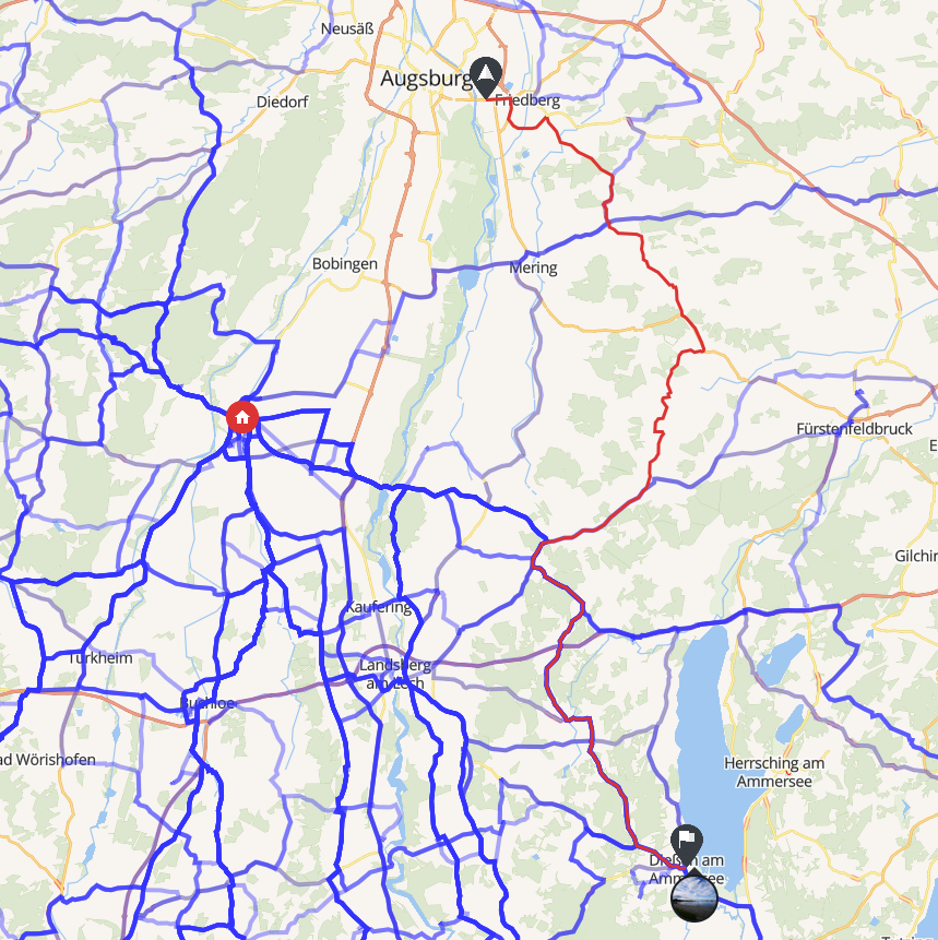 Ich habe es mal ausprobiert: Ich habe eine Tour zwischen Augsburg-Hochzoll (Zedlitzstraße, gleich ums Eck von der B2 nach Mering) bis nach Dießen am Ammersee geplant, Stadtmitte. Die auf Kurviger.de geplante Route habe ich nach Scenic exportiert, die im Power-Planner geplante Route habe ich von Scenic als GPX-File exportiert und dann in Kurviger.de importiert. Auf der unten abgebildeten Karte sieht man beide Routen. Die Route mit den vielen Zwischenstopps drin ist die in Scenic erstellte. Der von Kurviger.de vorgeschlagene Track verläuft östlich davon und ist violett-gestrichelt. Noch weiter östlich sieht man eine grüne Linie, das ist die Luftlinie zwischen den Zielen.