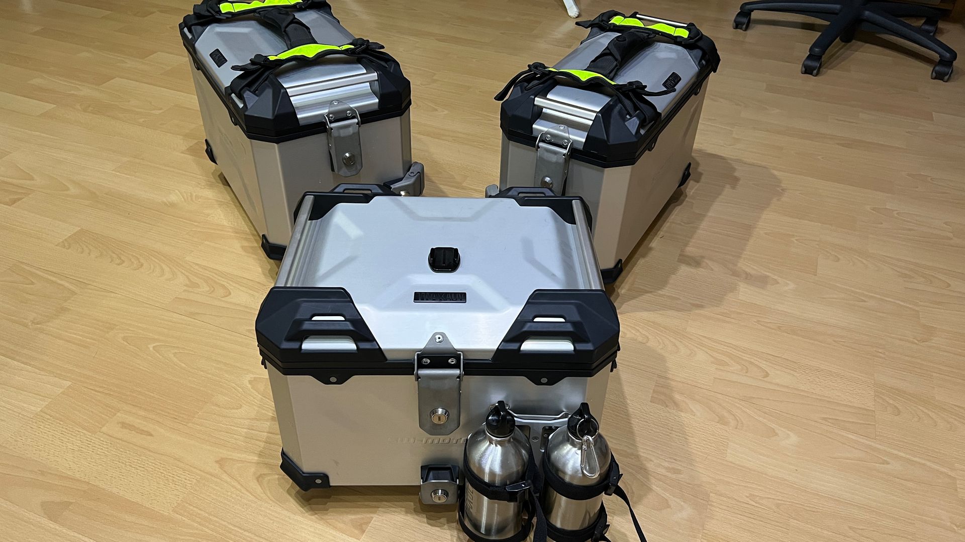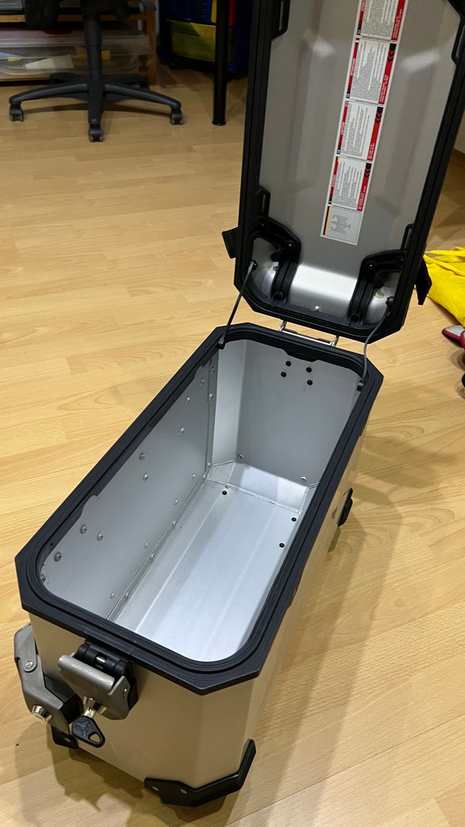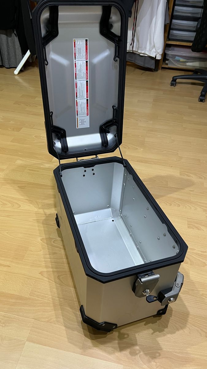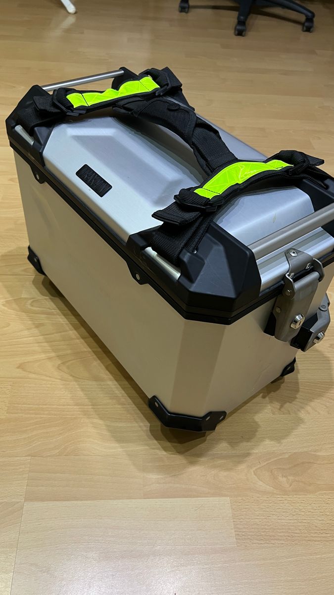 Das Topcase wurde ein paarmal benutzt, bis ich mir ein modifiziertes Topcase mit nur 20l gebaut habe. Die Seitenkoffer sind unbenutzt und ich habe gerade einmal die Schutzfolien entfernt.