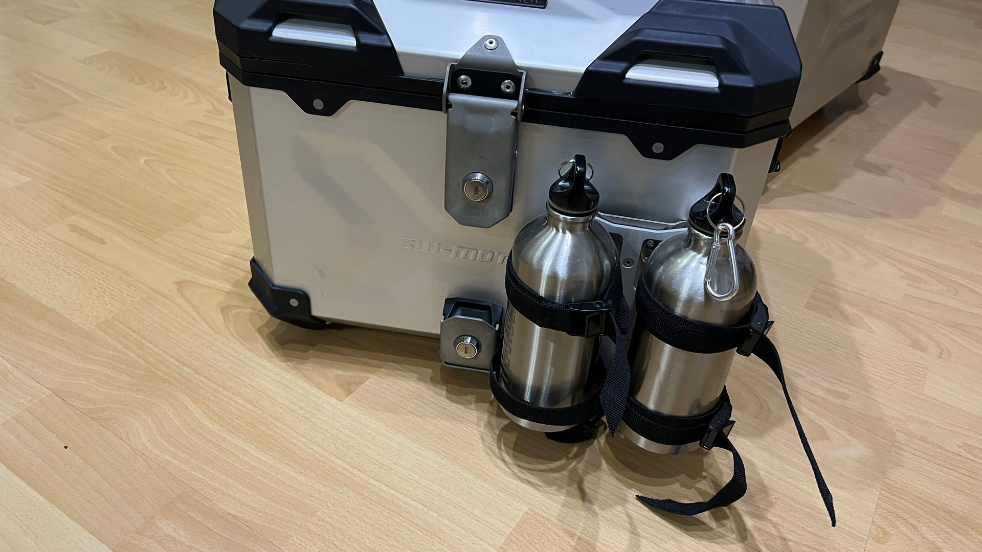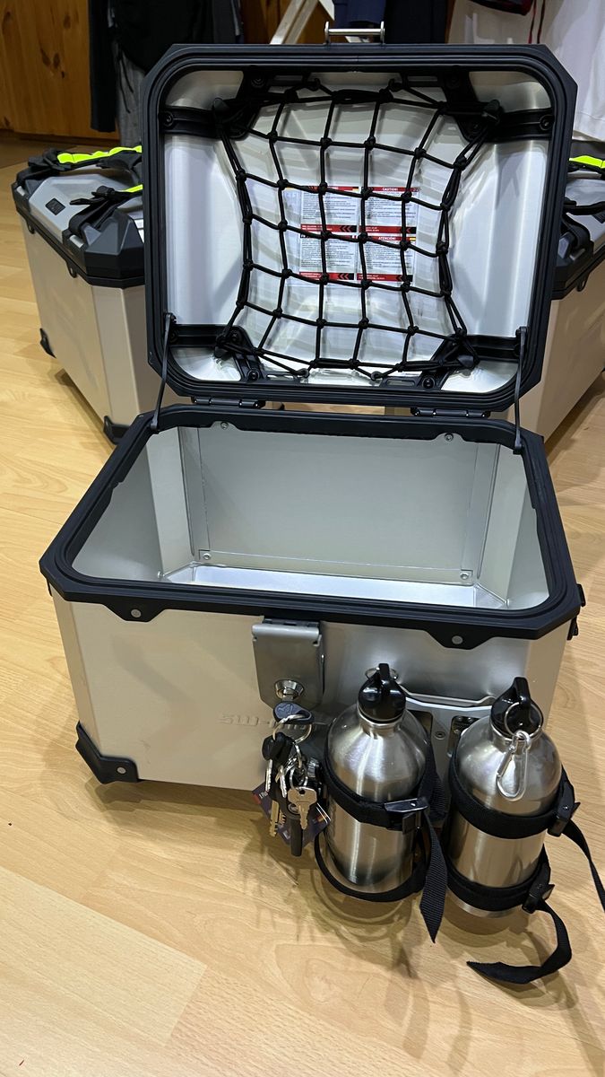 Das Topcase ist mit einem Deckelnetz ausgestattet und hat eine Aufnahme für 2 Trinkflaschen (werden mitgeliefert).