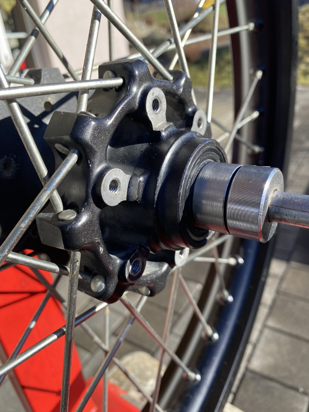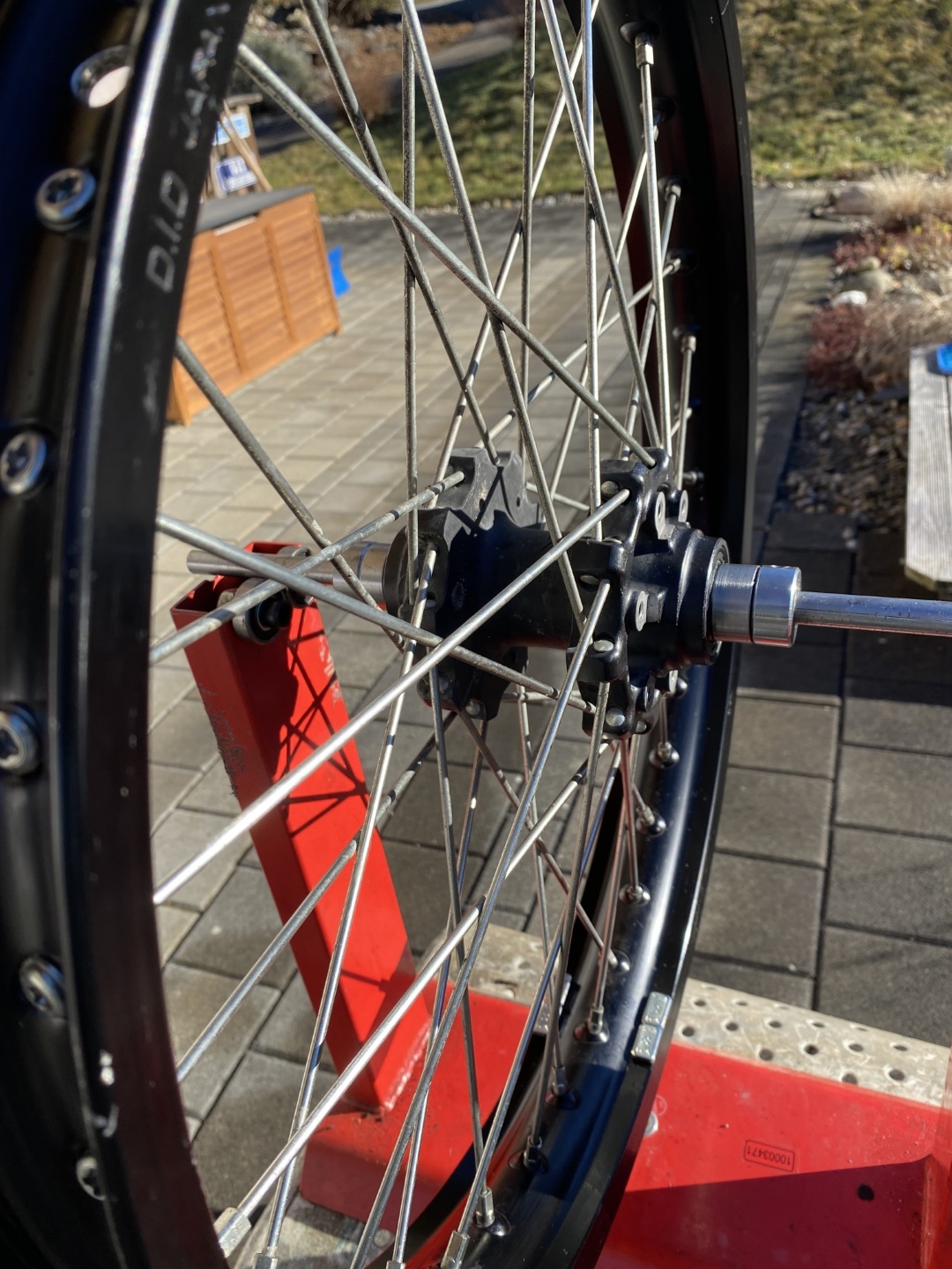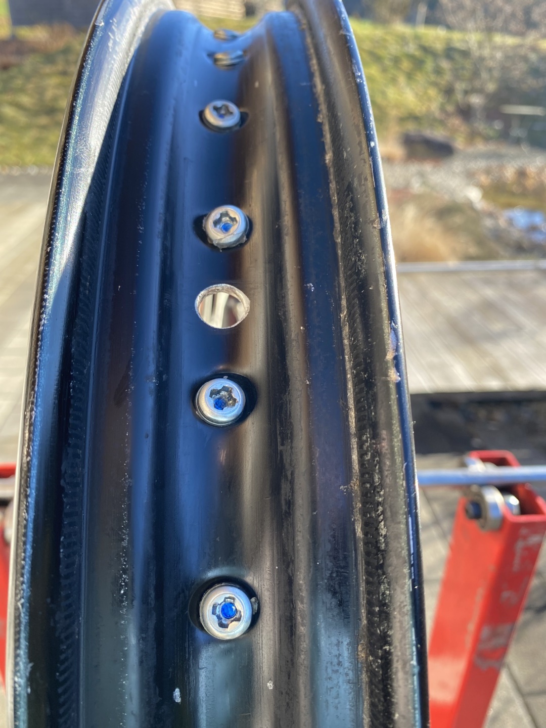 Die Felgen wurden via Tape abgedichtet und schlauchlos gefahren. Deshalb wurde das Ventilloch auf 12mm erweitert. Dies hat auf die Funktion keinen Einfluss. Das Tape wurde vollständig entfernt.
