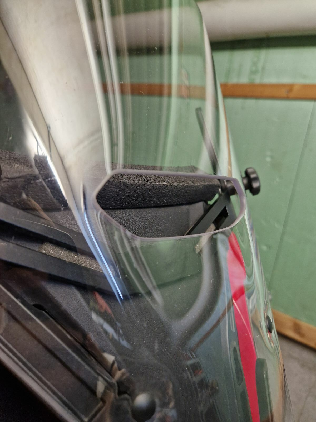 Durch den Höhenversteller ist der Abstand zwischen der Motorradverkleidung und dem Windschild vergrößert worden. Der hier durchgeleitete Wind trifft direkt auf mein Helm.