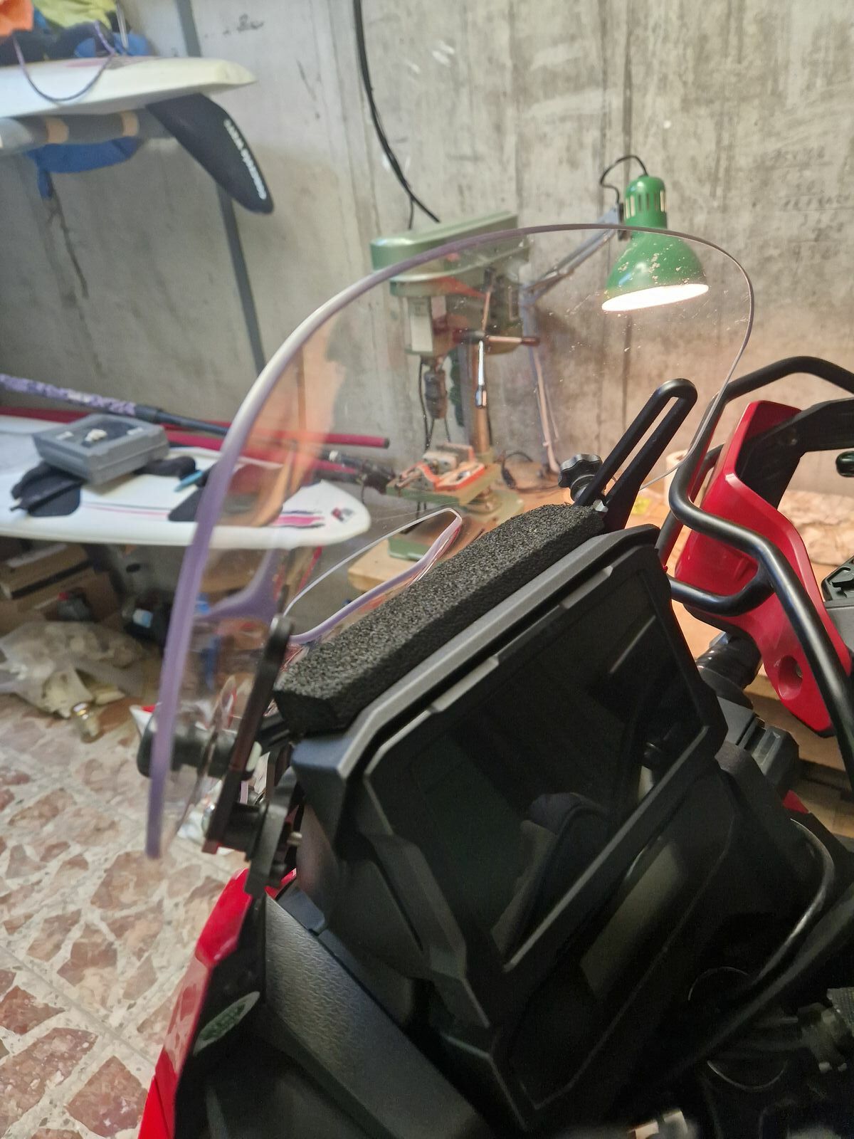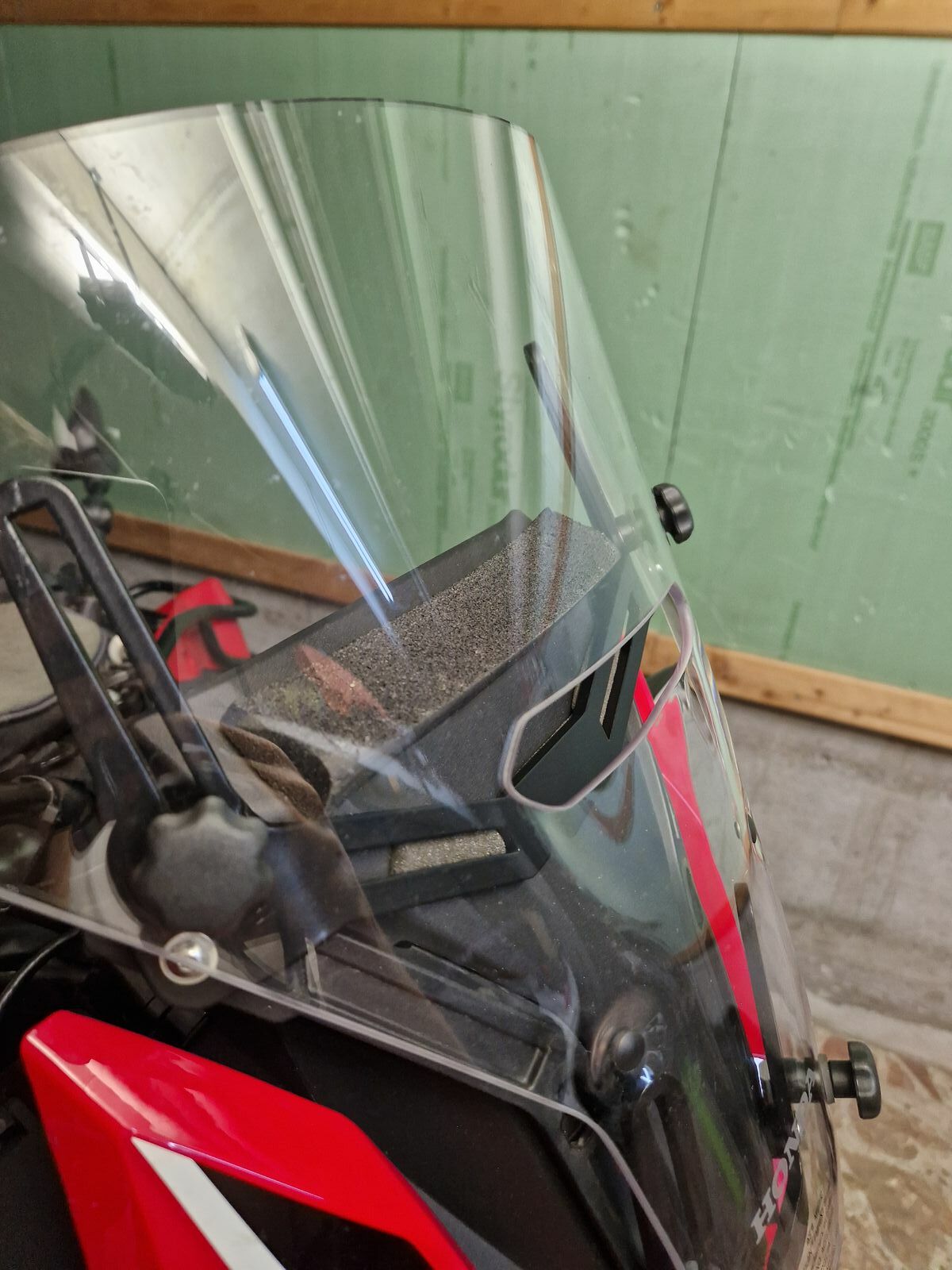 Um die Geräusche zu eliminieren habe ich mir mit Schaumstoff einen Windabweiser zwischen Verkleidung und Wildschild gebastelt: