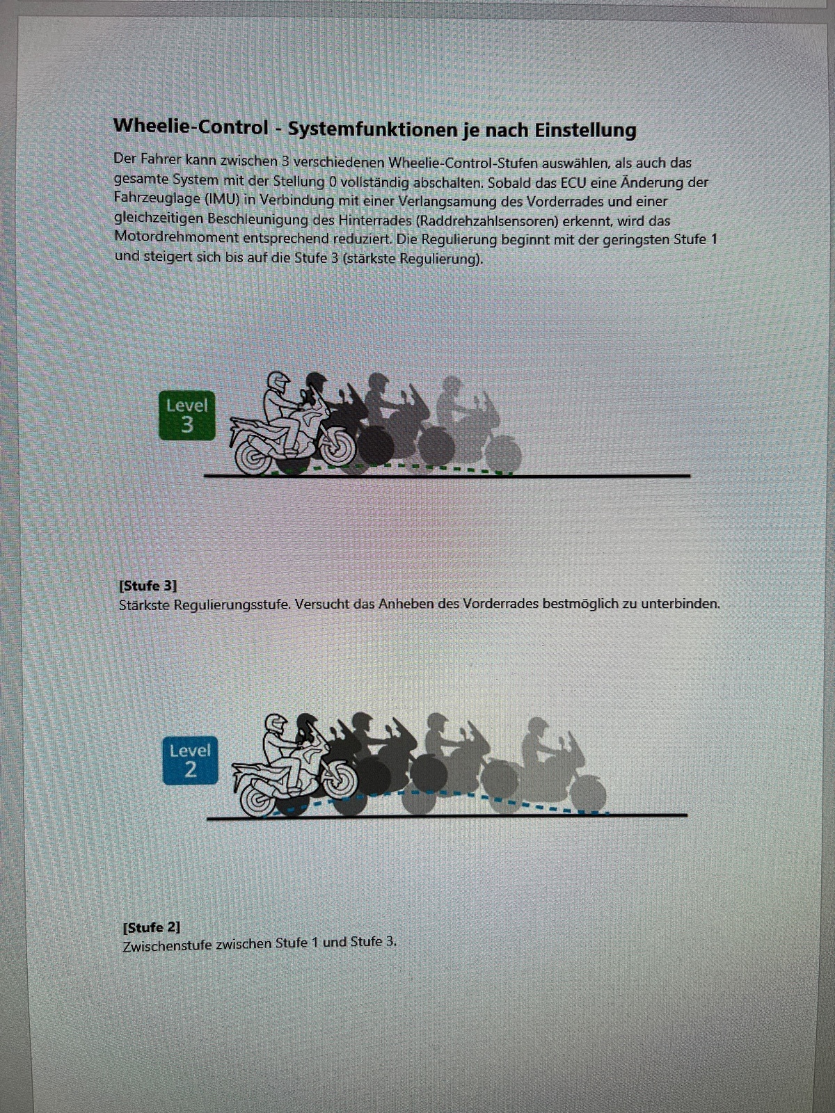 Das wollte ich auch gerade sagen. Es gibt doch bei der 1100er ein wenig Uneinigkeit, was genau höchste oder niedrigste Stufe macht. Maximal kann ja bei der Wheeliekontrolle entweder heißen, dass er maximal regelt, oder, dass er am meisten Wheelie zulässt, bevor er regelt.