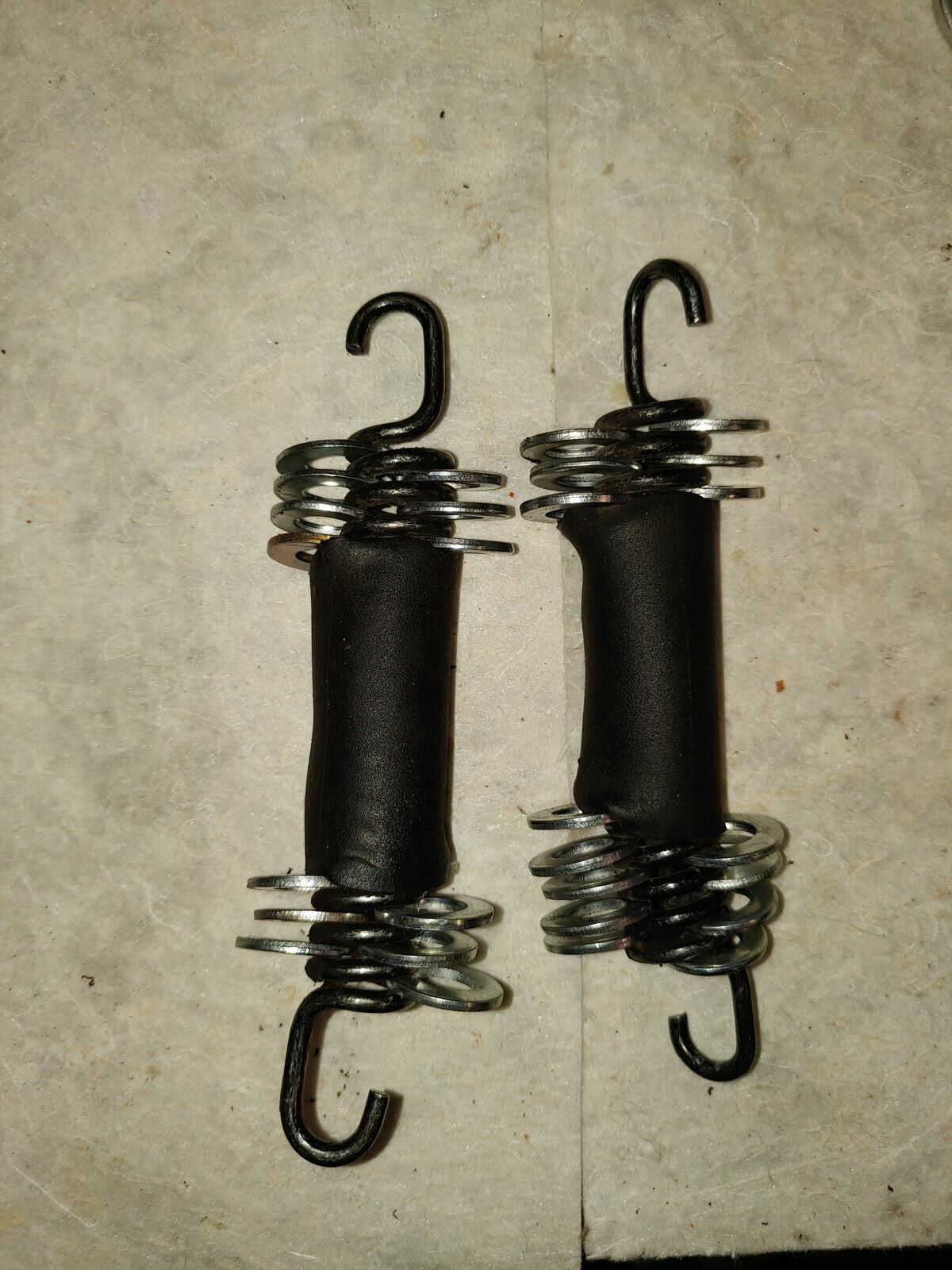 Feder an einem Ende in den Schraubstock spannen. Zwischen die Windungen Unterlagscheiben fummeln (geht ganz gut wenn die Feder dabei leicht hin und her bewegt wird). Feder einhängen. Moped auf den Hauptständer stellen, dann fallen die Scheiben einfach raus oder man kann sie rausziehen.