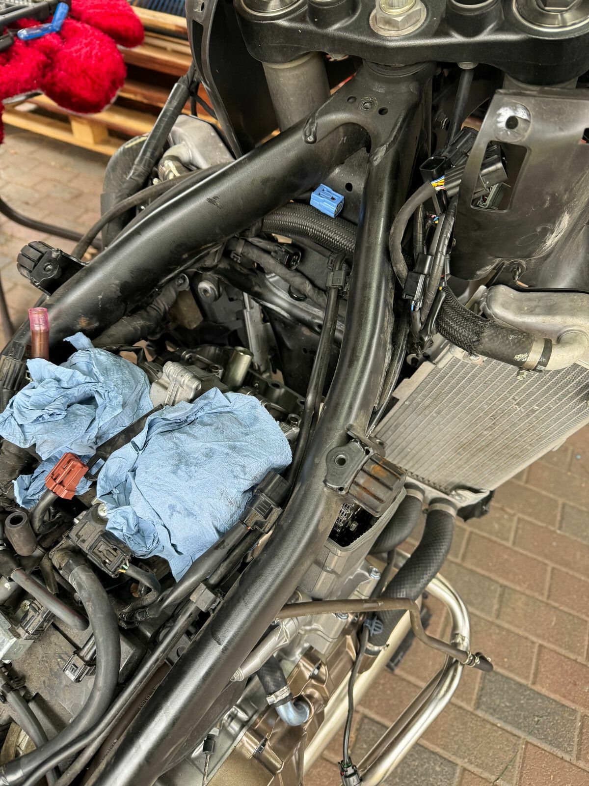 Jetzt zu meinem Problem, leider habe ich es offensichtlich vergessen ein Foto von der Lage der Stecker unter der rechten Seitenverkleidung, oben am Kühler anzufertigen. Die Leitungen sind seeeeehr seeeehr kurz. Kann mir vielleicht jemand die passende Seite aus dem Werkstatthandbuch zur Verfügung stellen? Oder ein Foto aus dem die korrekte Lage hervorgeht? Ich kann fast erahnen welche Kommentare ich jetzt Gefahr laufe zu bekommen, aber das Risiko gehe ich ein.