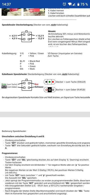#46 Alles anzeigenVom Aufschneiden des Kabelbaums ist bei Verwendung des Universalkabels nicht die Rede. Es ist lediglich ein einziges Kabel (rosa Signalleitung), das getrennt und mit dem Kabel des SpeedoHealers verbunden werden muß.