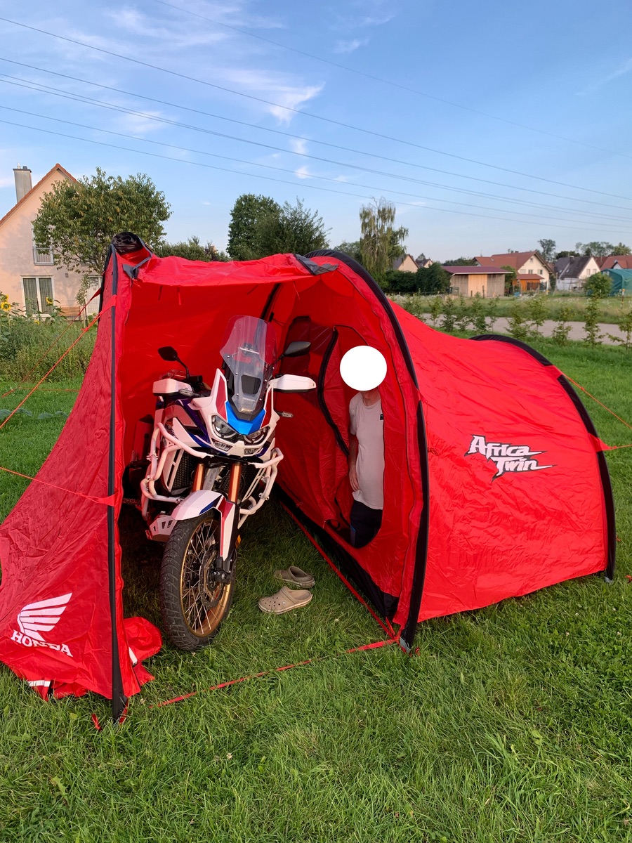 Die "Zeltgarage" bietet Platz für die Africa Twin mit Koffern, sowie bis zu zwei Personen.