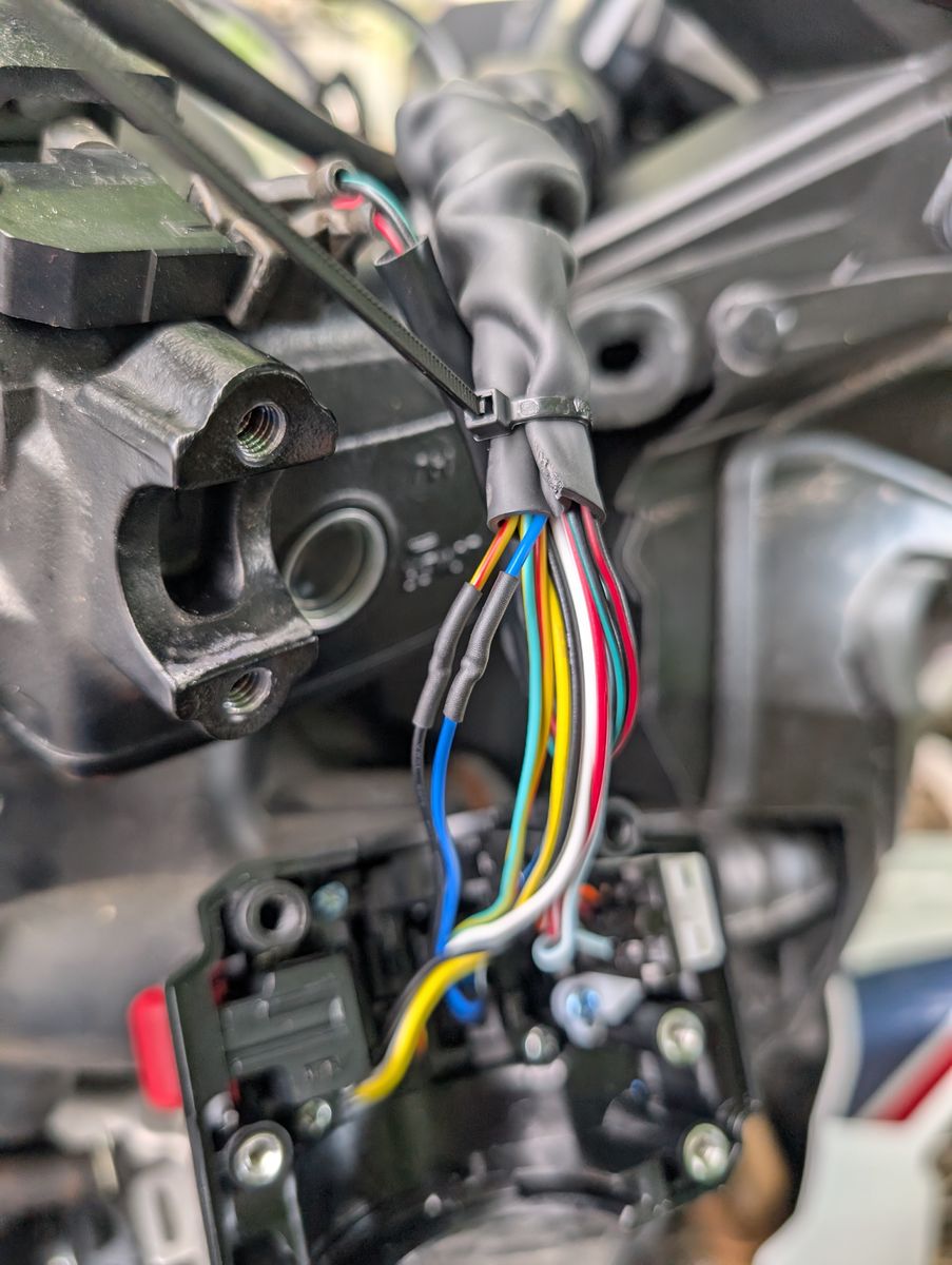 Also baute ich die rechte Verkleidung der AT ab, löste die Tankverschraubung, im den Tank etwas anheben zu können und kam so an die Steckverbindung der. rechten Lenkerschaltereinheit. Die rechte Lenkerschaltereinheit habe ich natürlich auch geöffnet, um die Kabelfarben zu identifizieren.